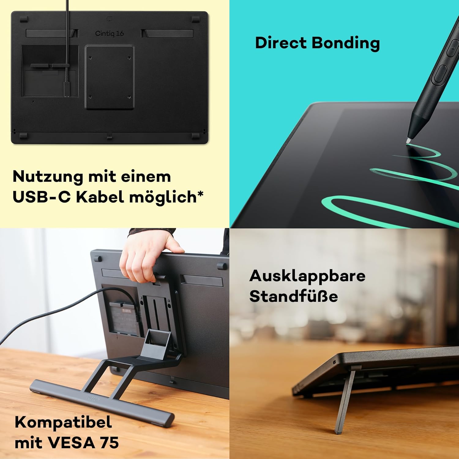 Das Wacom Cintiq 16 ist sofort einsatzbereit: Die integrierten Klappbeine bringen das Display auf einen angenehmen Winkel von 20°. Dank VESA-Halterung (75x75 mm) kannst du es mit kompatiblen Armen oder Ständern wie dem Wacom Adjustable Stand (ACK651KZ, separat erhältlich) nutzen.