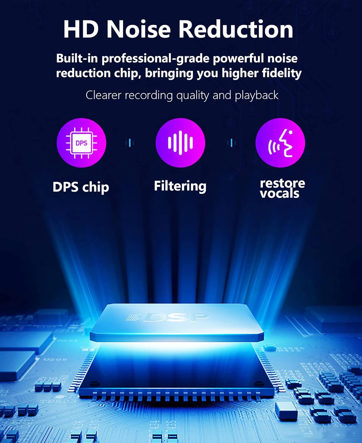 Вграден професионален мощен чип за намаляване на шума, който ви осигурява по-висока прецизност. По-ясно качество на запис и възпроизвеждане, слушайте звук на живо, интелигентно шумопотискане - вокалите са по-ясни, вграден кондензаторен микрофон с висока резолюция с голяма бленда и висока чувствителност.