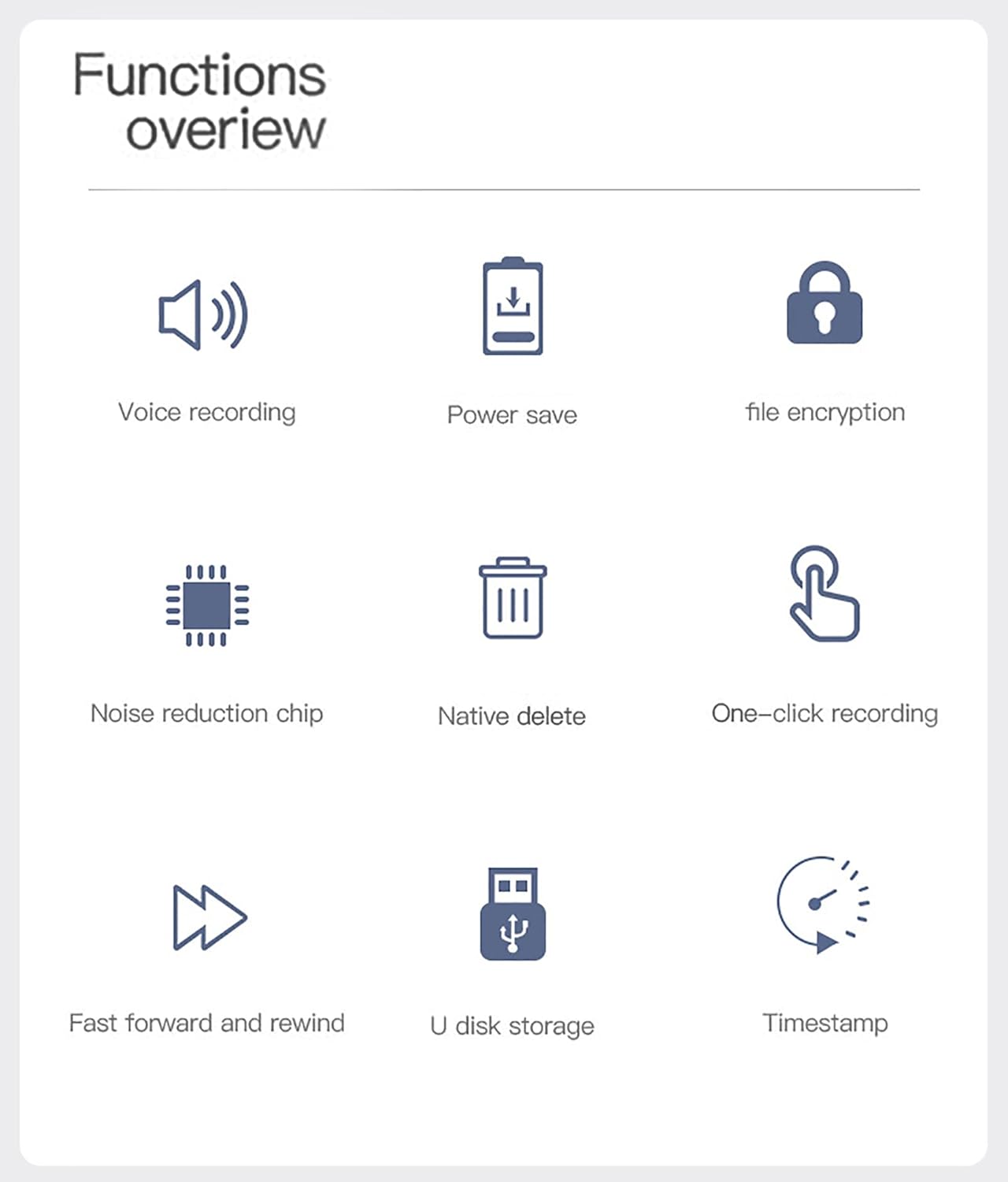 Вграден рекордер, поддържа включване на парола, интимна защита на аудио данните, без поверителност, без звук, без светлина, без вибрации, без звук, светлина или вибрации при запис, тиха работа.