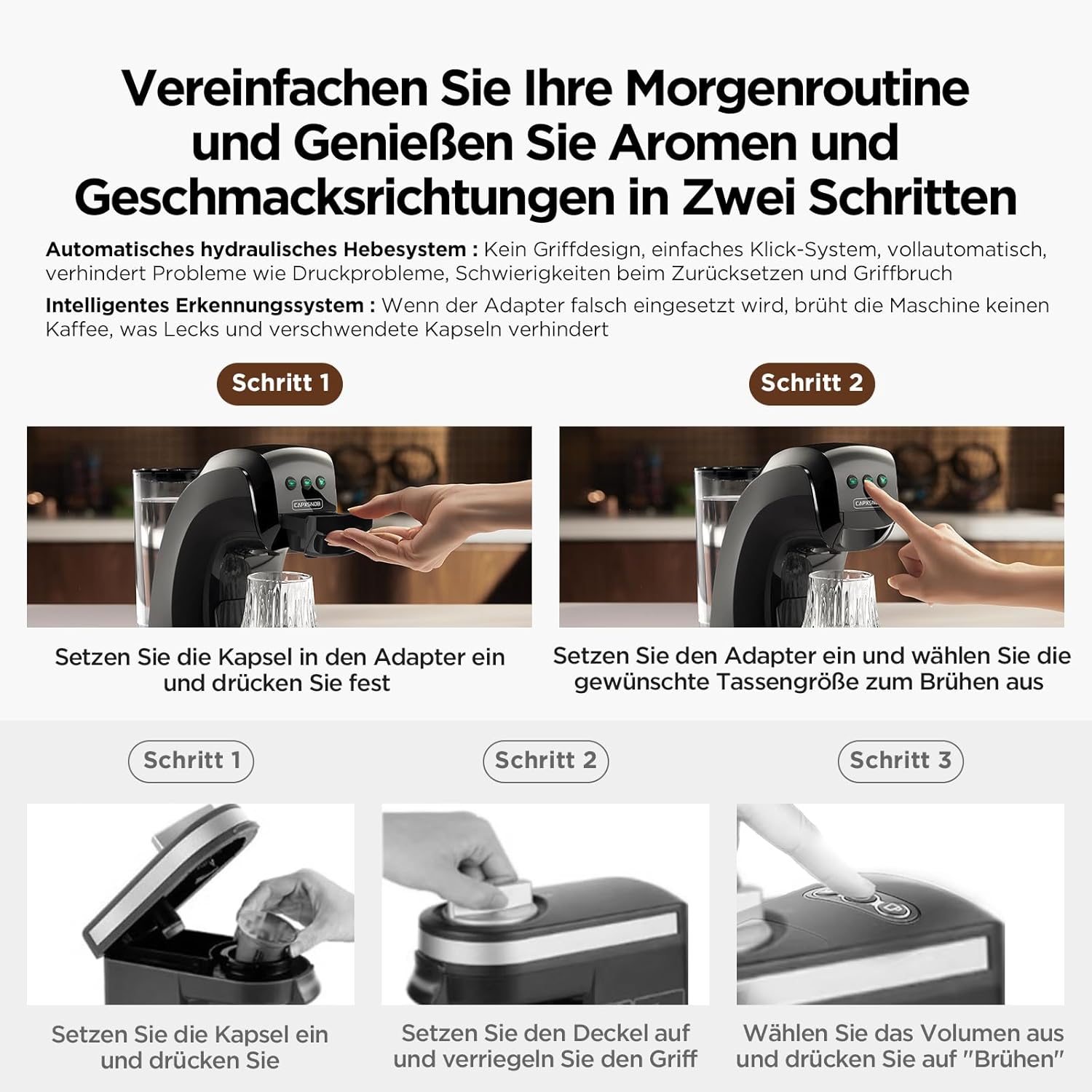 • Автоматична система: Кафемашината Warriors1 5-в-1 с капсули впечатлява със своята хидравлична технология: капсулите могат лесно да се заключват и отключват. Поставете капсулата, изберете един от трите бутона за екстракция и се насладете на перфектното си кафе. Известие за отстраняване на котлен камък се активира след 200 чаши, за да се улесни поддръжката. Подвижният резервоар за вода от 0,8 литра и лесният за почистване адаптер запазват ароматите на капсулите и осигуряват чист вкус с всяка чаша.