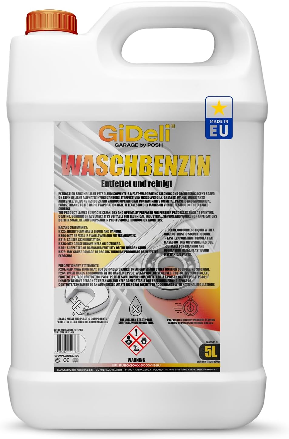 Effective cleaning of stubborn dirt. Wound petrol is a powerful solvent that works great at removing stubborn dirt on metallic, mechanical and technical surfaces. It is particularly effective in removing lubricants, oils, paints, adhesive residues, markers and industrial contaminants. With its special formula, it allows quick and efficient cleaning of even the most stubborn contaminants, making it an indispensable tool in workshops, garages and laboratories. Lightning-fast evaporation and streak-free cleanliness. The cleaning fluid for textiles evaporates quickly after application and leaves no greasy residue. It requires no additional cleaning, keeping treated surfaces dry and streak-free. This product is ideal for professional cleaning of machine parts, tools and brake elements that need to be prepared for further processing, such as painting or assembly. Versatility and wide applicability flock remover for the flocking of textiles and the pack to degreaser offer a wide range of applications. The product is ideal for degreasing components before painting or gluing and helps eliminate various contaminants in workshops, factories and garages. It greatly improves the efficiency of work and allows quick preparation of components for the next step of work. Safe to use under suitable conditions. Due to its high flammability, the product should only be used in well-ventilated rooms, away from fire sources, sparks and hot surfaces. Contact with the skin and inhalation of vapours should be avoided to ensure safety during use. Wash benzine for textiles ensures efficiency and safety in various technical environments when used correctly. Easy to use for better results. Application of wound petrol is quick and easy. Apply a small amount of product to the surface to be cleaned with a cloth, brush or sprayer. After a short exposure time, dirt is effectively removed and the surface remains clean and ready for further use. The product allows precise cleaning and is therefore an indispensable tool for professional maintenance and work that requires high level of detail.