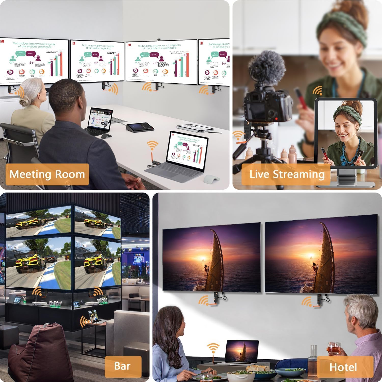 • Широка съвместимост: съвместим с различни HDMI устройства с безжично предаване, включително кабелни приемници, Blu-ray плейъри, DVD-та, лаптопи, компютри, стрийминг устройства (напр. Apple TV, Fire Stick), DSLR фотоапарати, видеокамери, цифрови приемници, саундбари, караоке устройства, телевизори, проектори, монитори и други. В WELUSOPU ние отстояваме ангажимента си за качество, надеждност и вашето удовлетворение.