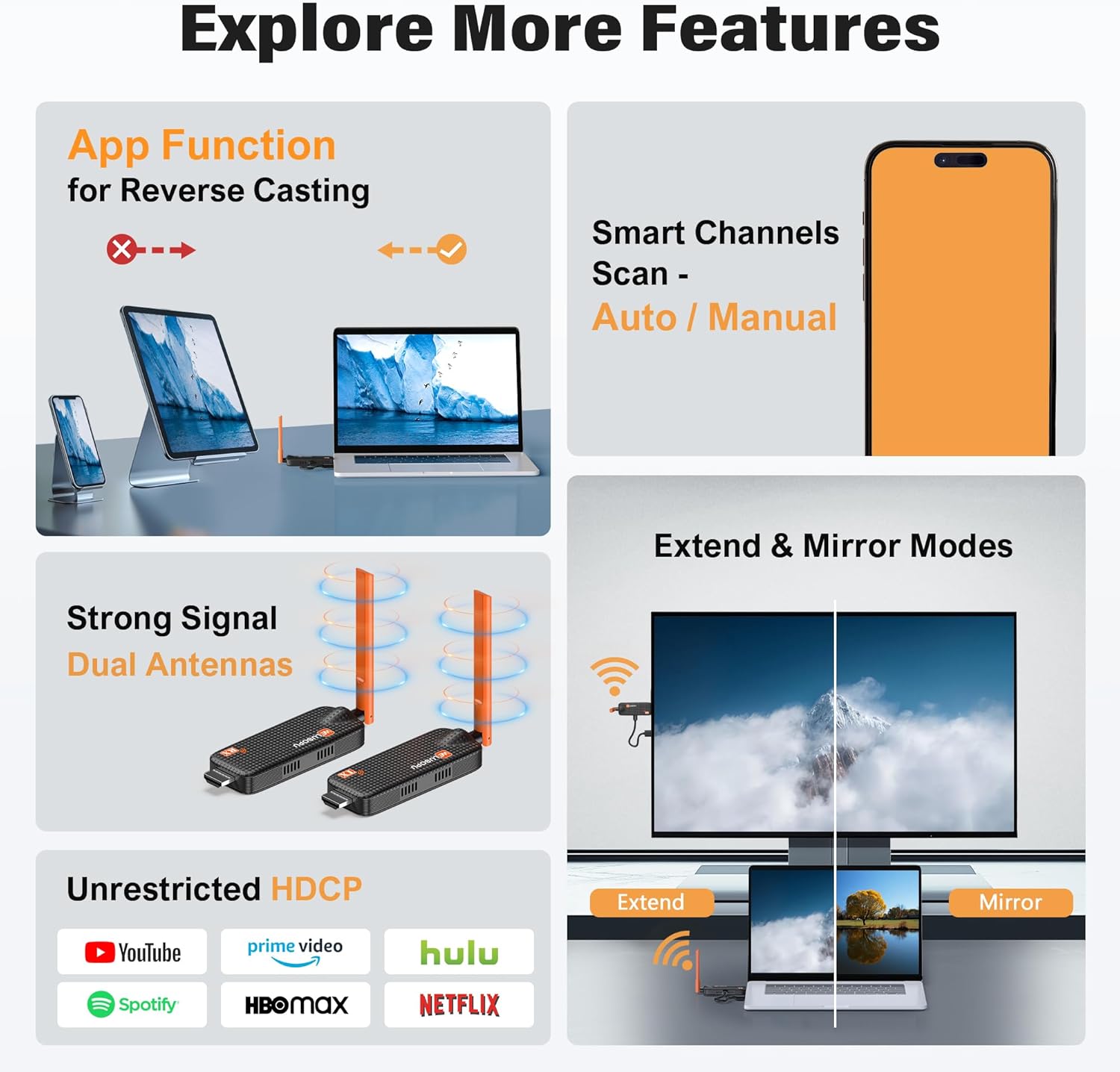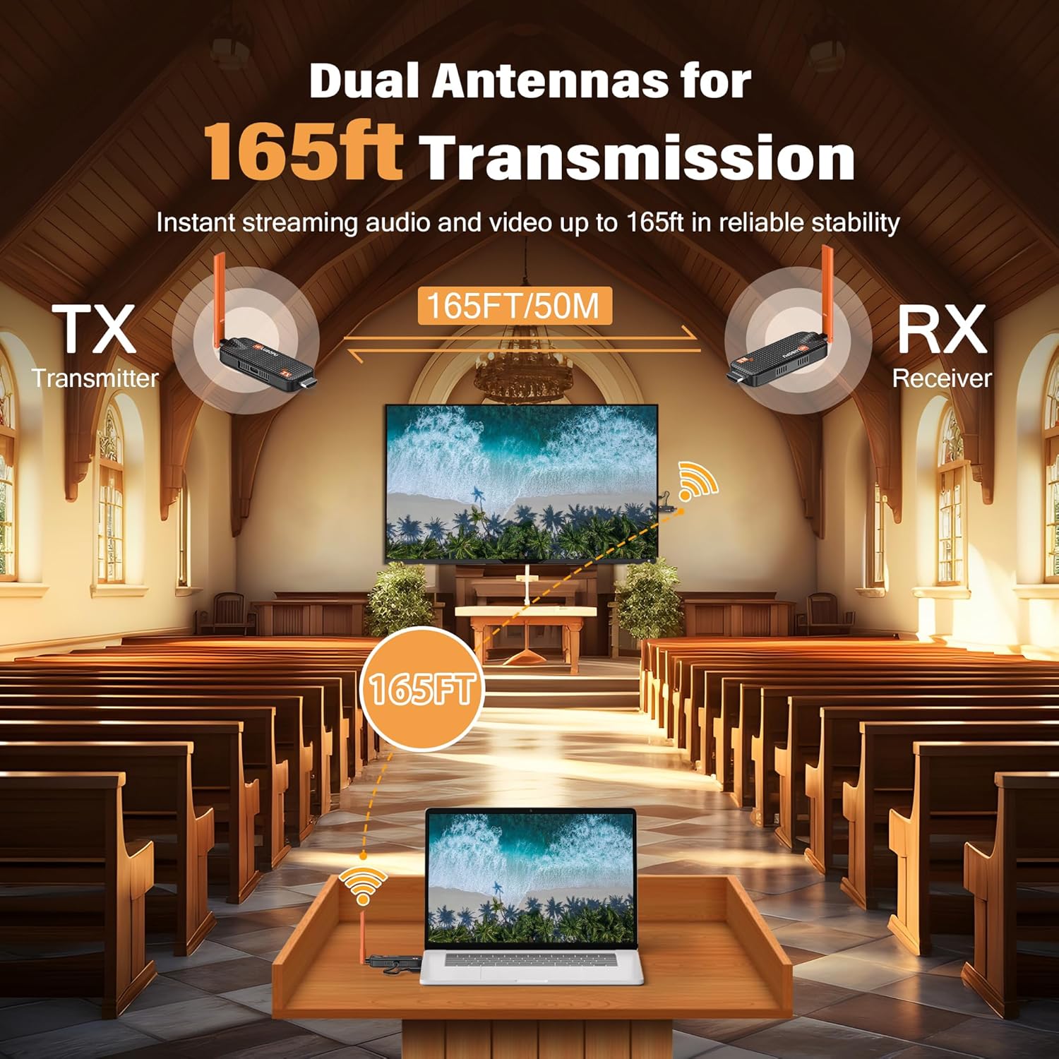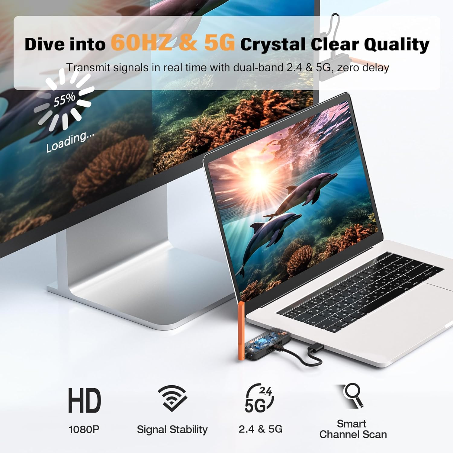 • Предаване с голям обхват и ниска латентност: насладете се на стрийминг на екрана със стабилен обхват на сигнала до 50 метра (165 фута) на открити пространства. С усъвършенствана HDMI технология за радиопредаване, поддръжка на 5.8G/2.4G двойна лента, автоматично превключване на честотата и 60Hz, тази HDMI безжична връзка гарантира на предавателя и приемника почти никаква латентност и връзка без смущения, дори в взискателни WiFi среди.