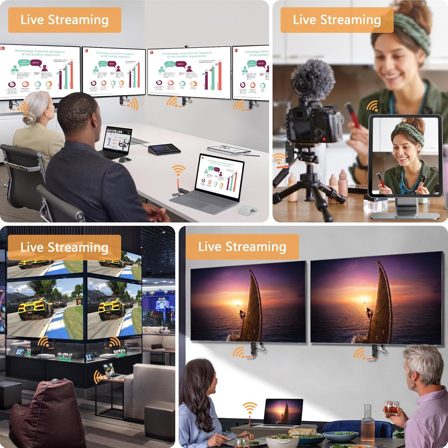 • Стриймвайте към 6 дисплея едновременно: безжичният HDMI предавател и приемник WELUSOPU ви позволява без усилие да стриймвате съдържание на до 6 големи екрана едновременно. Идеален за многодисплейни конфигурации в домашни кина, офиси, класни стаи или търговски обекти, той елиминира нуждата от множество кабели и сложни конфигурации. Насладете се на плавно стриймване без смущения, дори на четири дисплея.