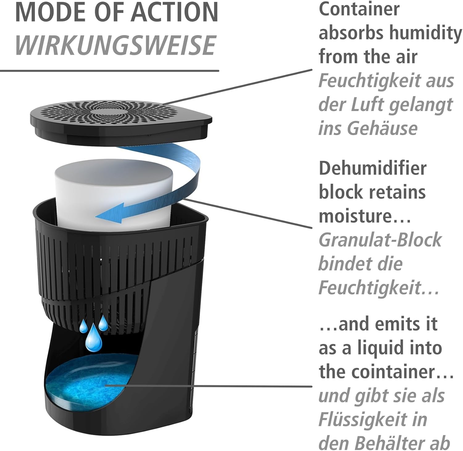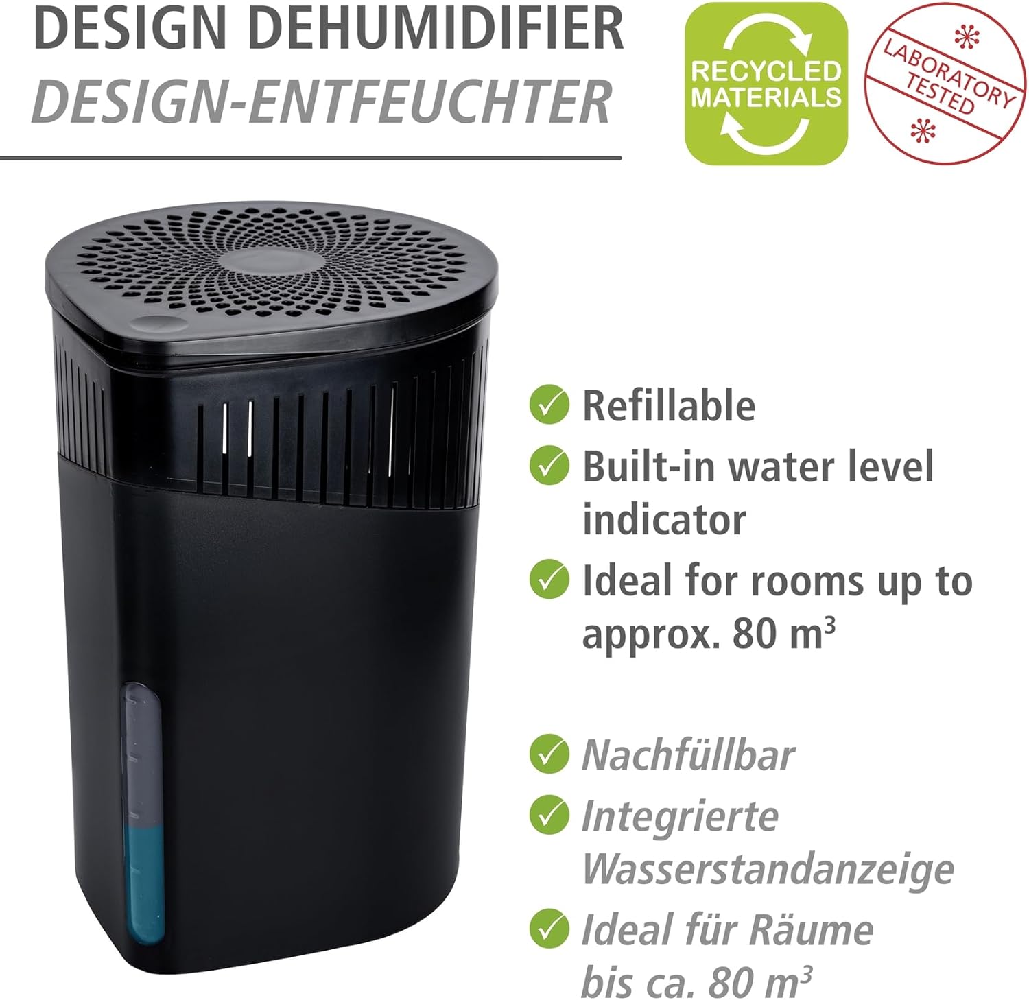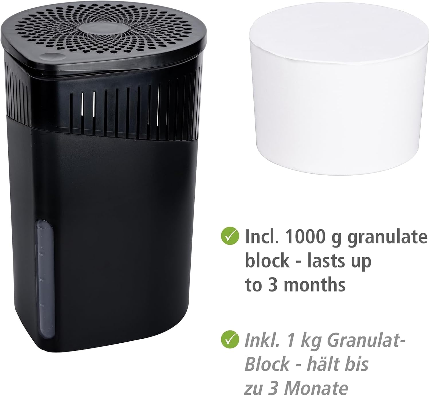 Този елегантен влагоабсорбатор е идеален за помещения до 80 м³. Съдържа 1000 г калциев хлорид, достатъчен за приблизително 3 месеца. Веднага след поставянето му, камъкът започва да абсорбира влага от околния въздух. Нивото на водата, събрано в влагоабсорбатора, може лесно да се следи по всяко време с помощта на вградения индикатор за нивото на водата, което демонстрира ефективността на този елиминатор на влага Wenko.