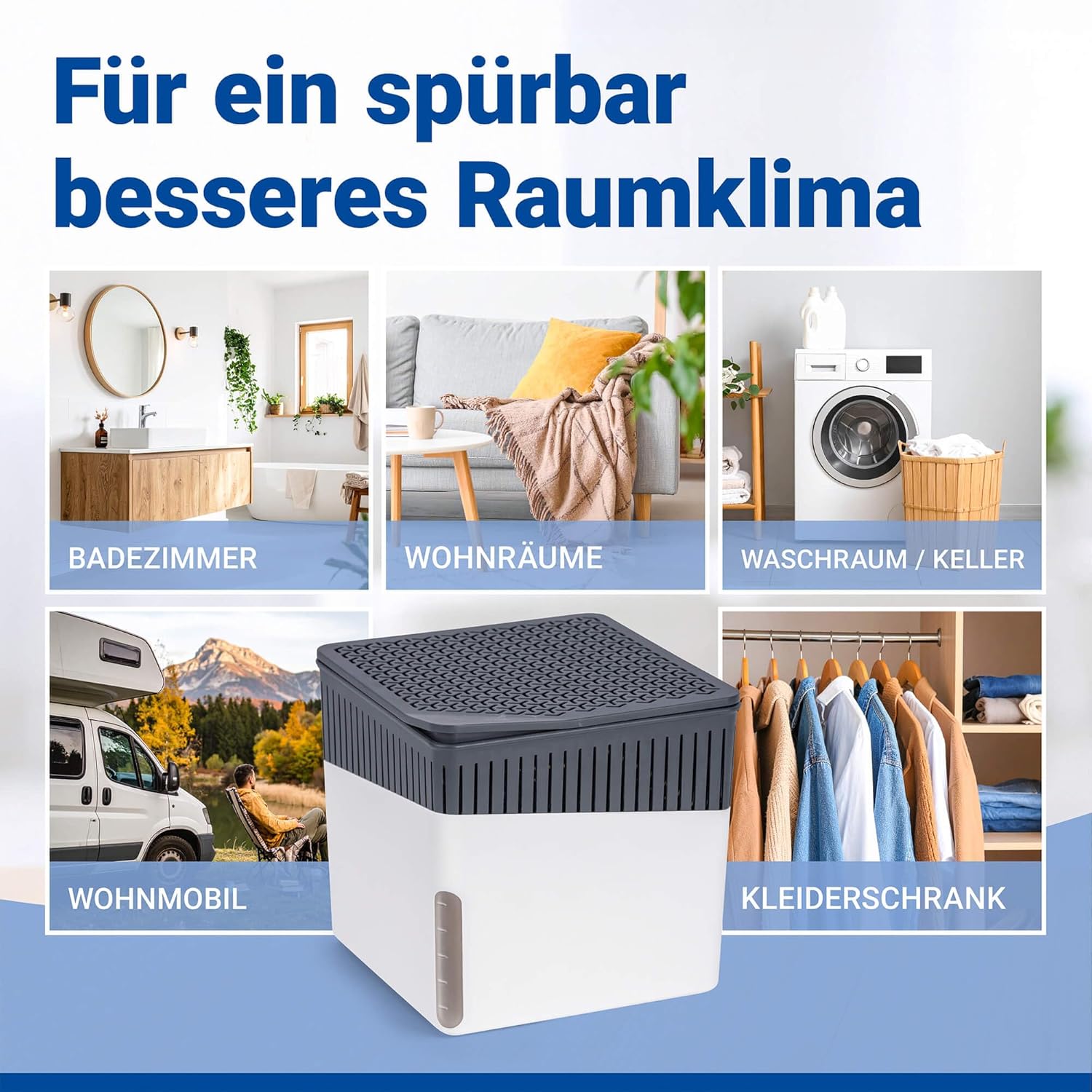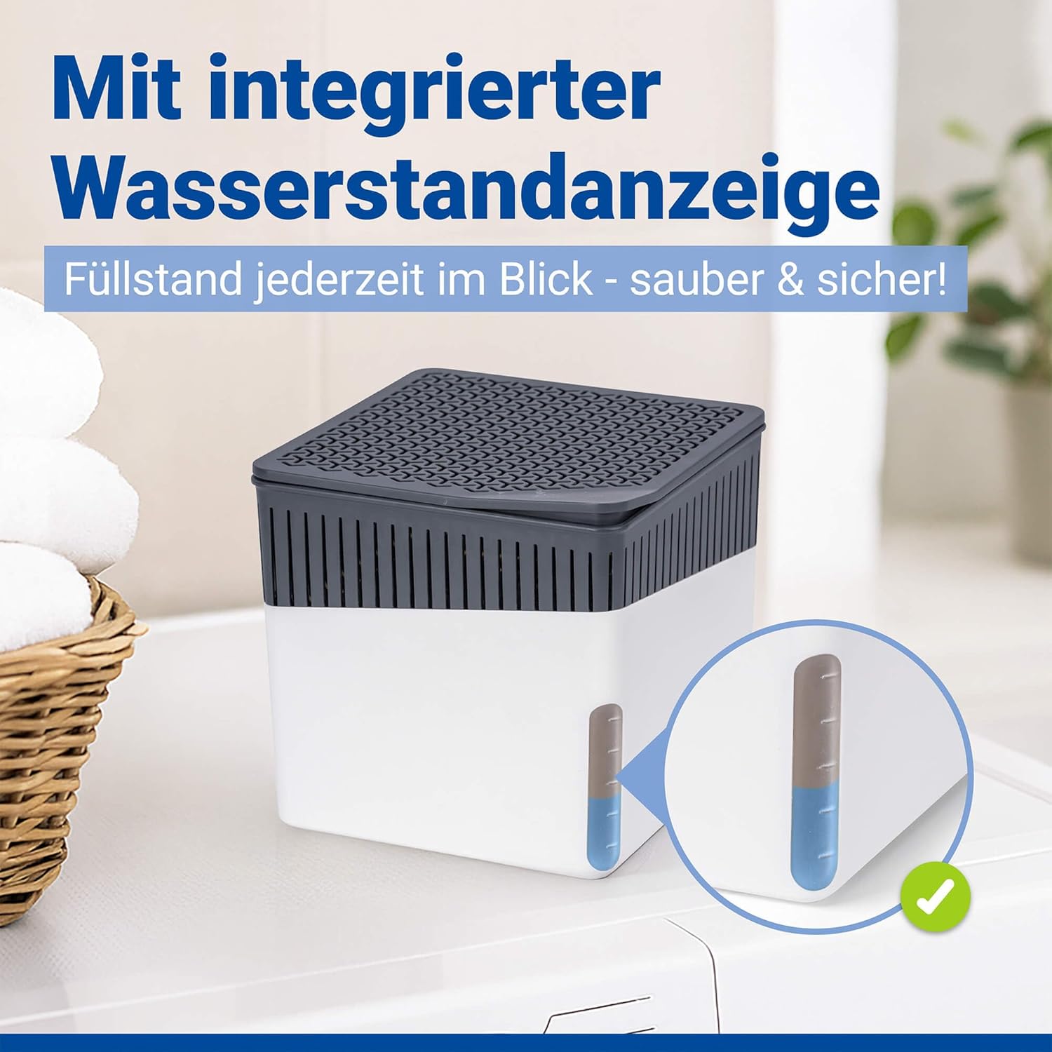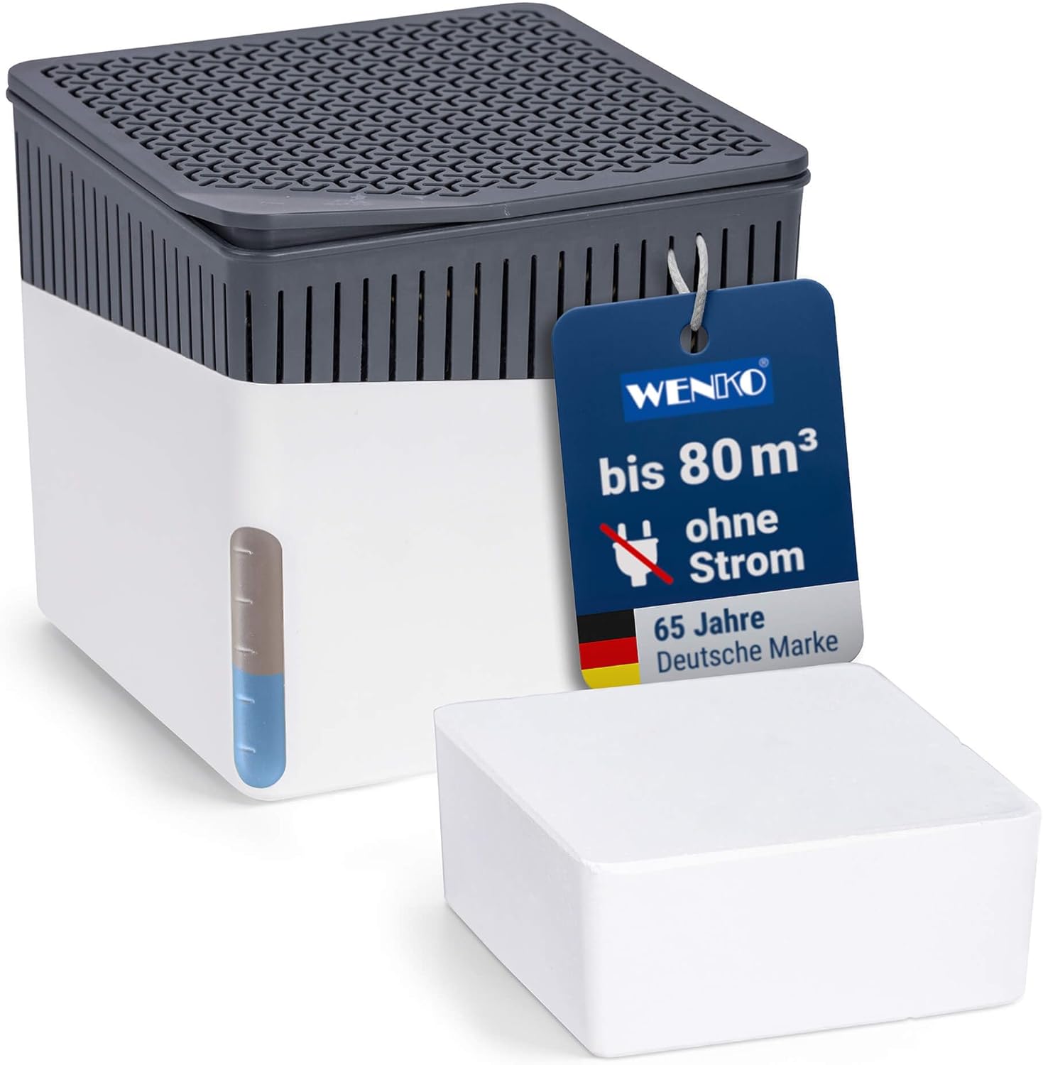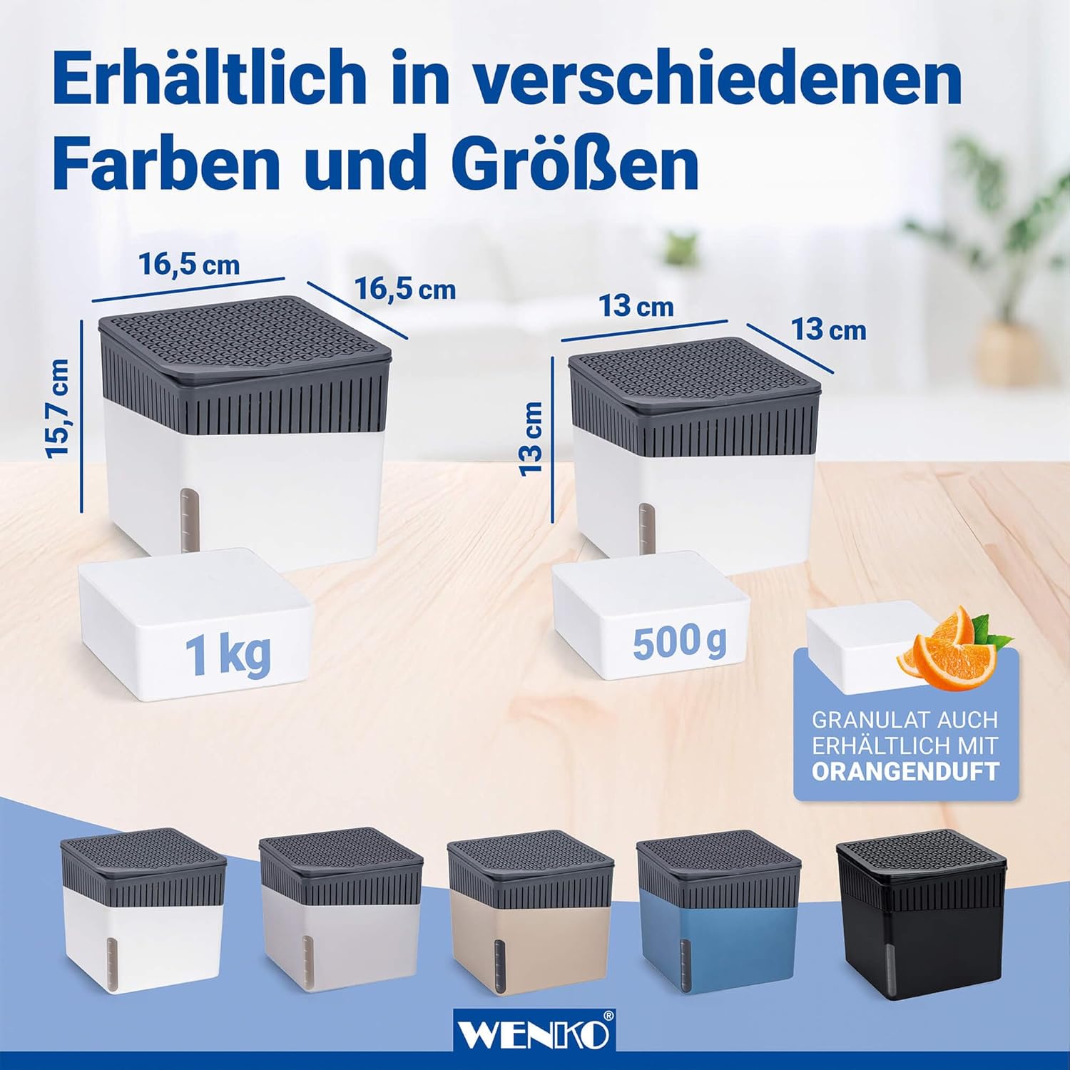 Дизайнерският куб за обезвлажнител от Wenko осигурява по-малко влага и по-приятен климат. Модерният обезвлажнител се интегрира елегантно във всяка стая и създава визуален акцент с модерна кубична форма.
