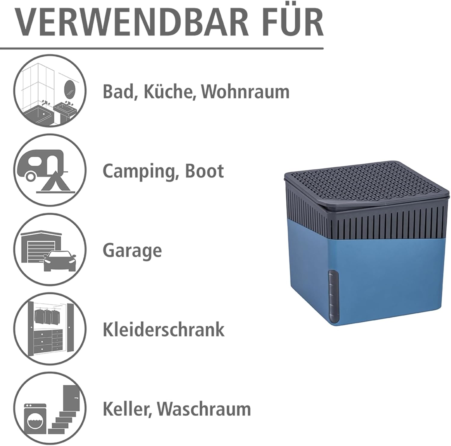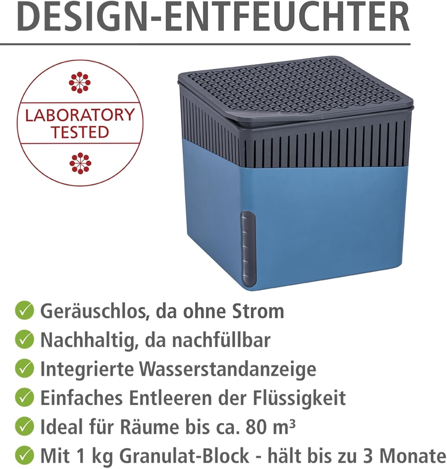 Дизайнерският куб за обезвлажнител от Wenko осигурява по-малко влага и по-приятен климат. Модерният обезвлажнител се интегрира елегантно във всяка стая и създава визуален акцент с модерна кубична форма.