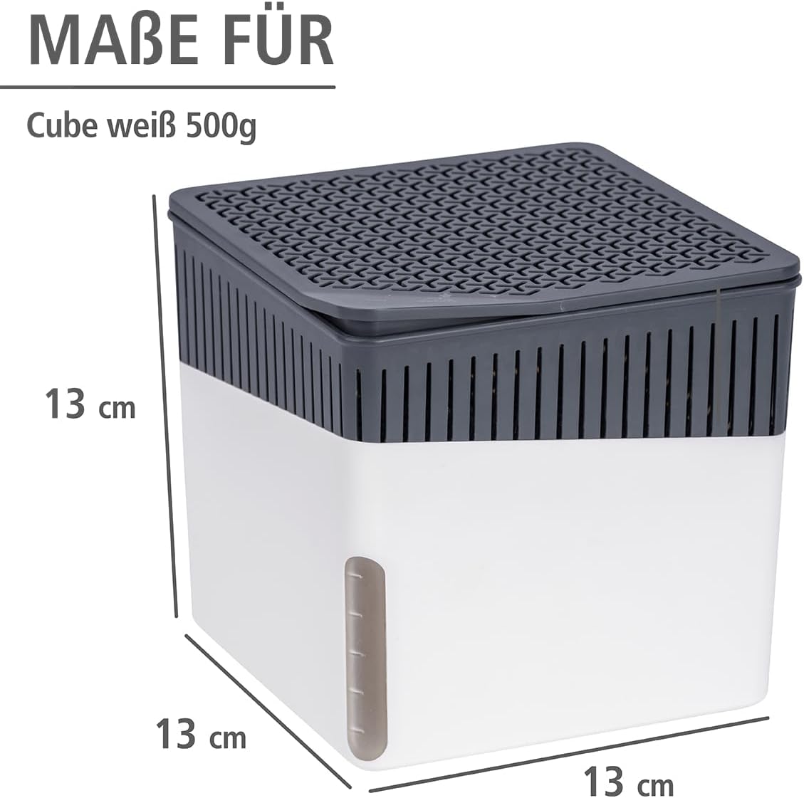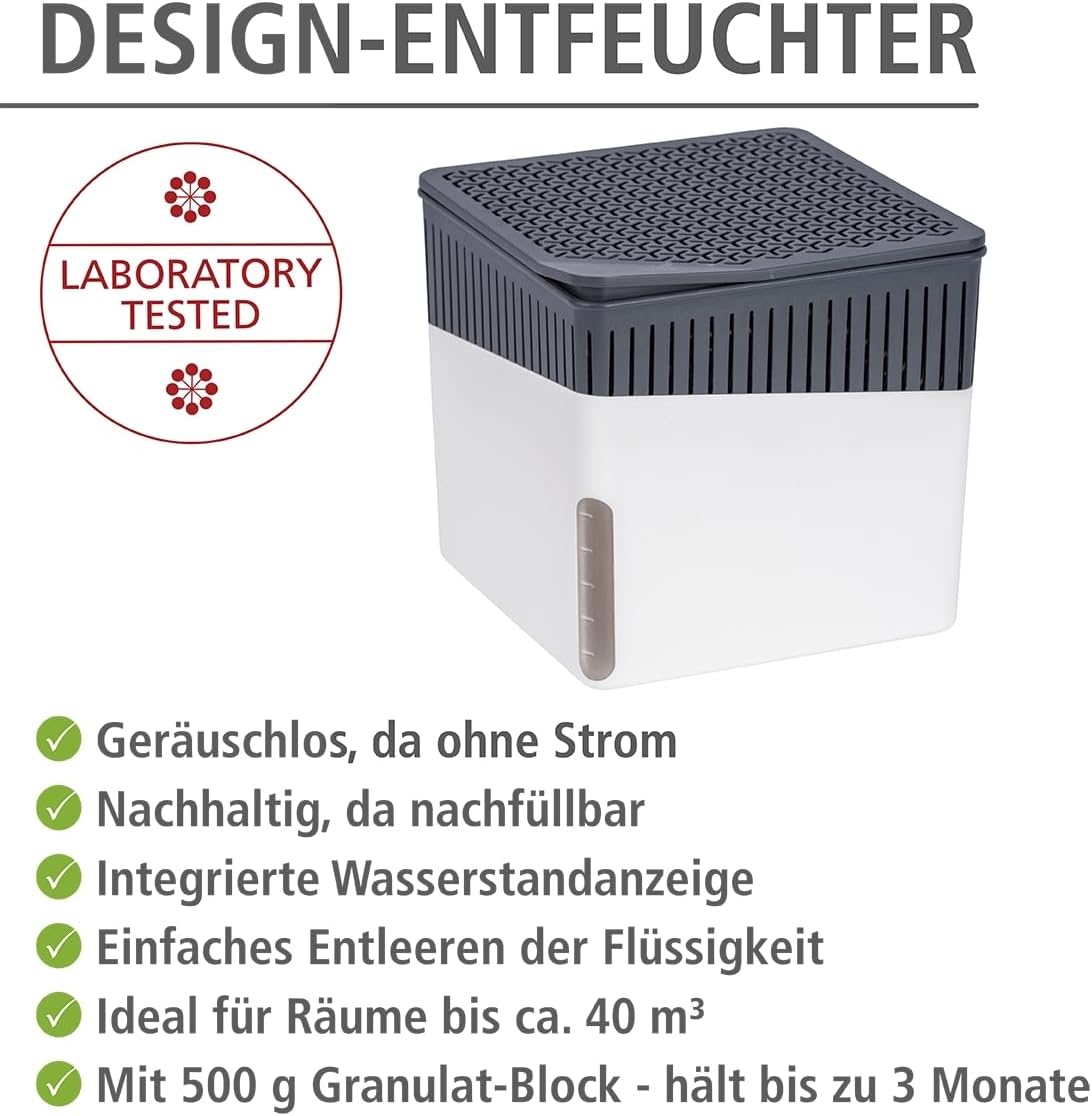 Дизайнерският куб за обезвлажнител от Wenko осигурява по-малко влага и по-приятен климат. Модерният обезвлажнител се интегрира елегантно във всяка стая и създава визуален акцент с модерна кубична форма.