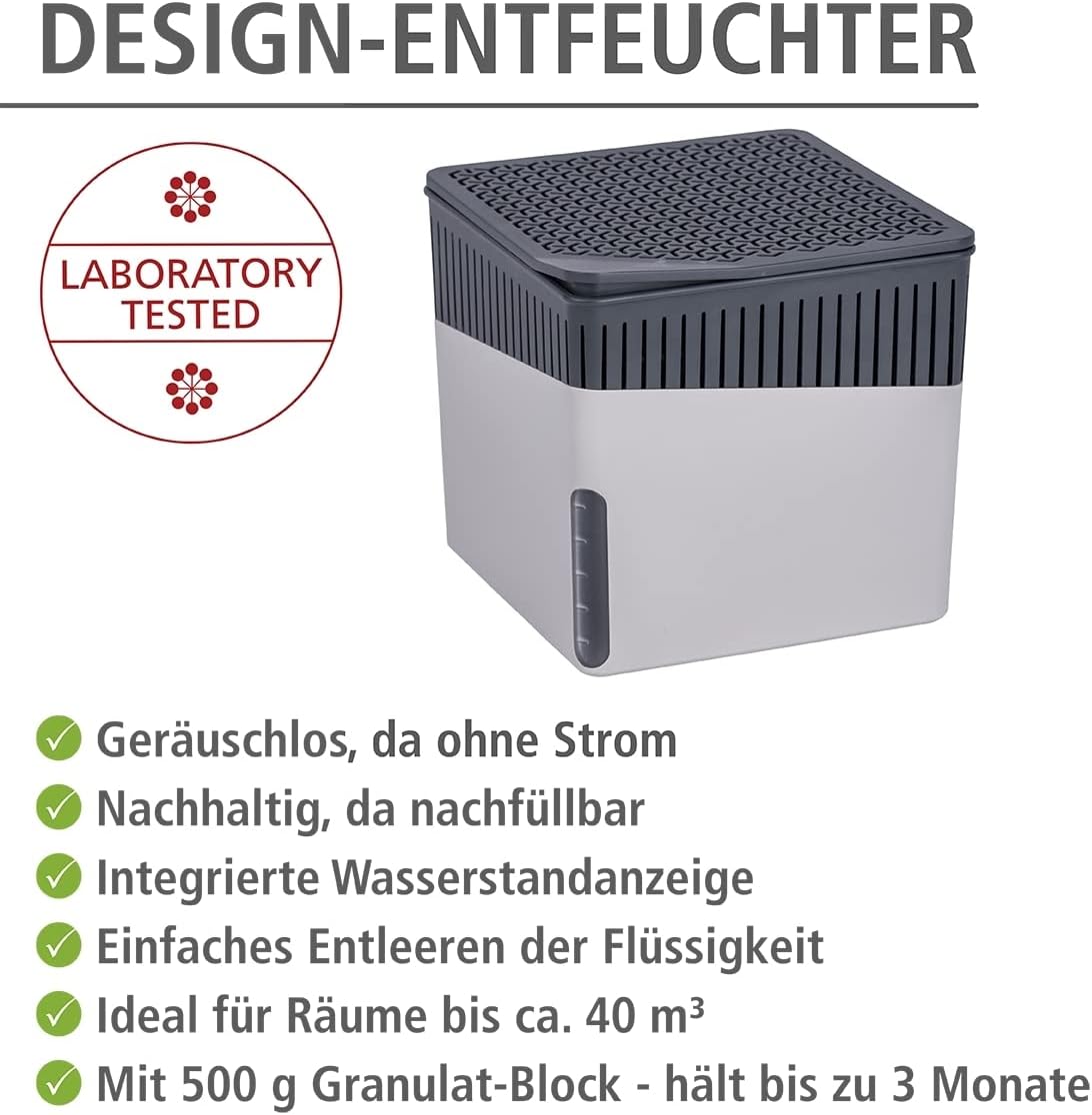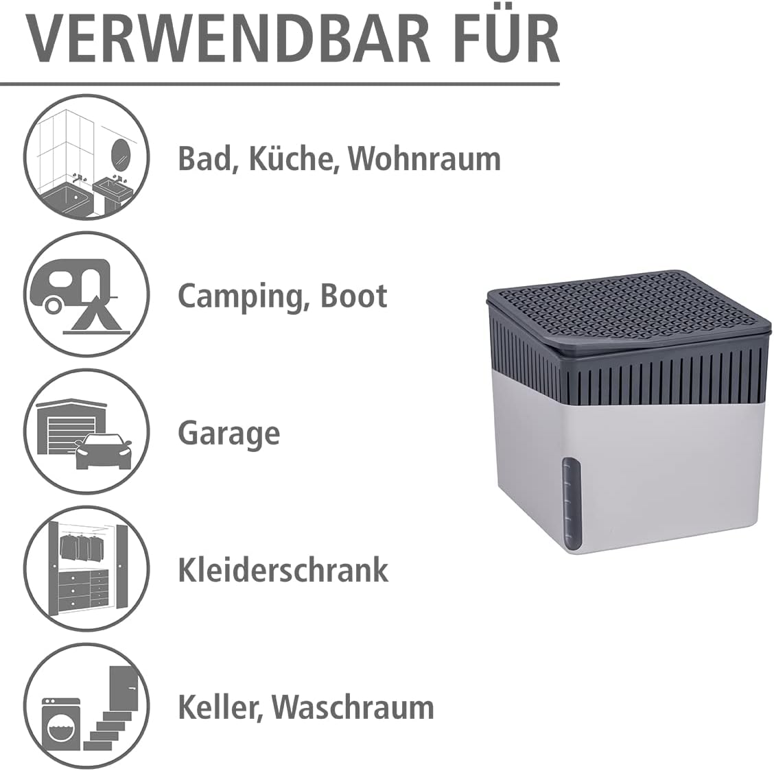 Дизайнерският куб за обезвлажнител от Wenko осигурява по-малко влага и по-приятен климат. Модерният обезвлажнител се интегрира елегантно във всяка стая и създава визуален акцент с модерна кубична форма.