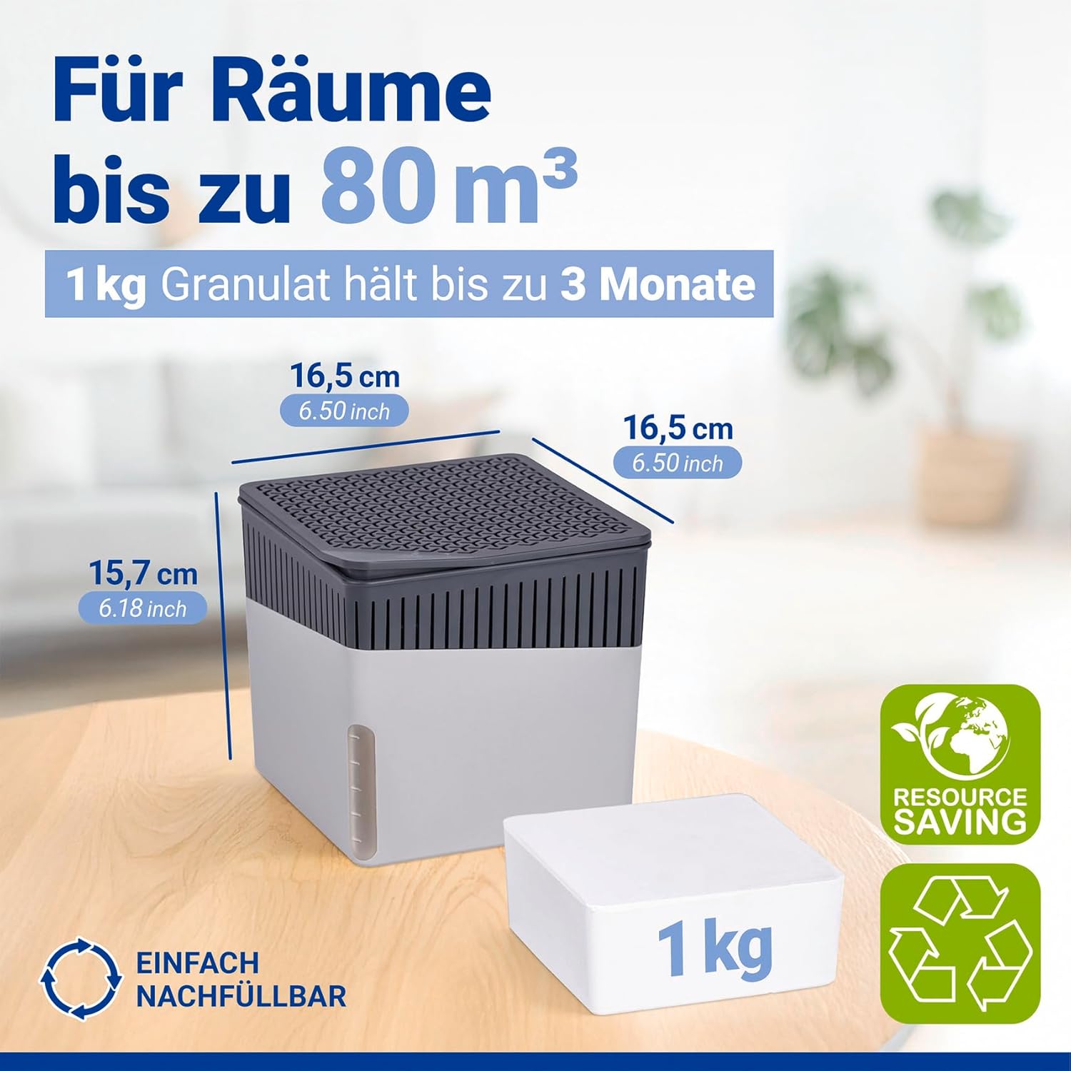The clever dehumidifier is ideal for rooms of up to 80 m³. The moisture remover contains 1,000 g of calcium chloride for approx. three months. Immediately after setting up, the stone begins to draw moisture from the surroundings.