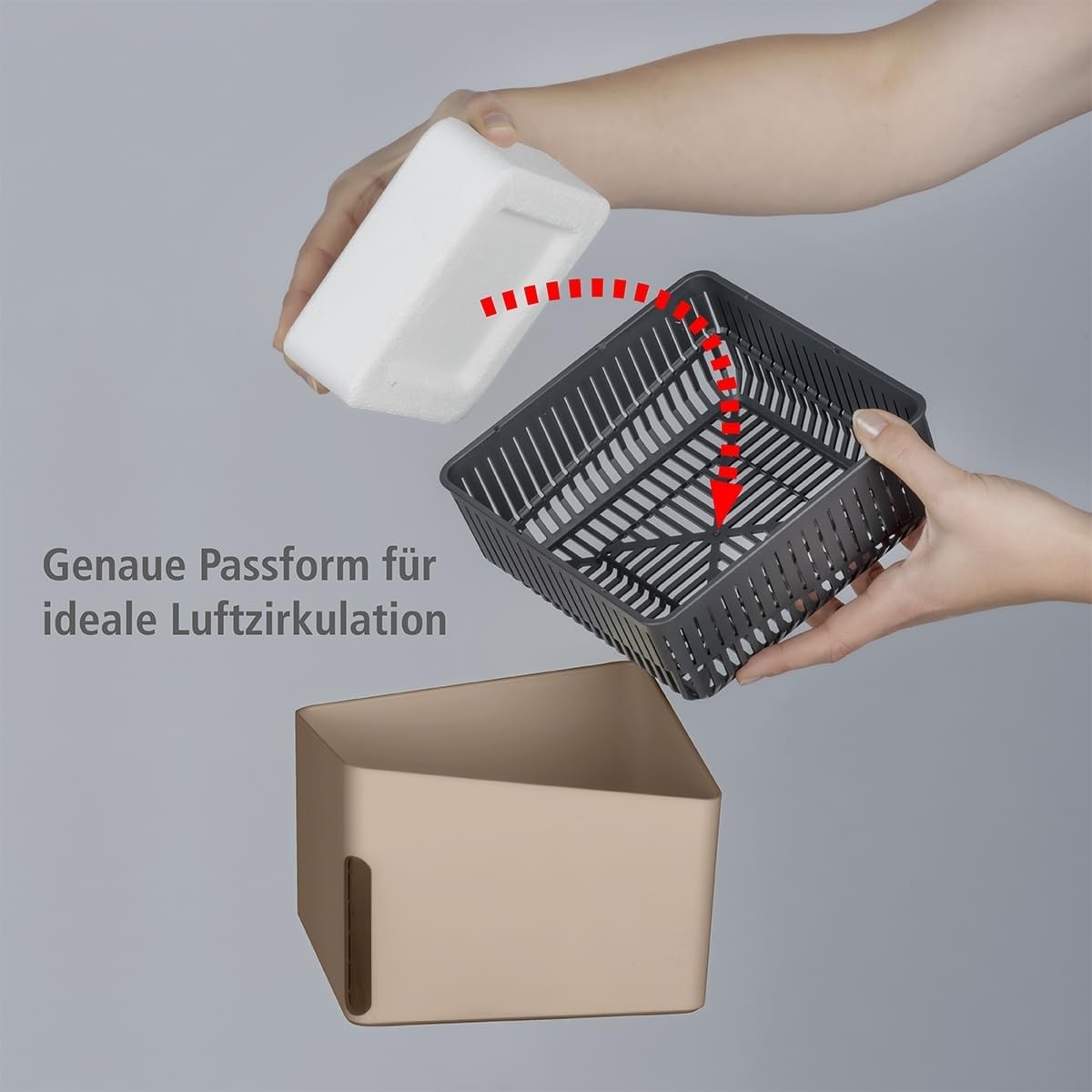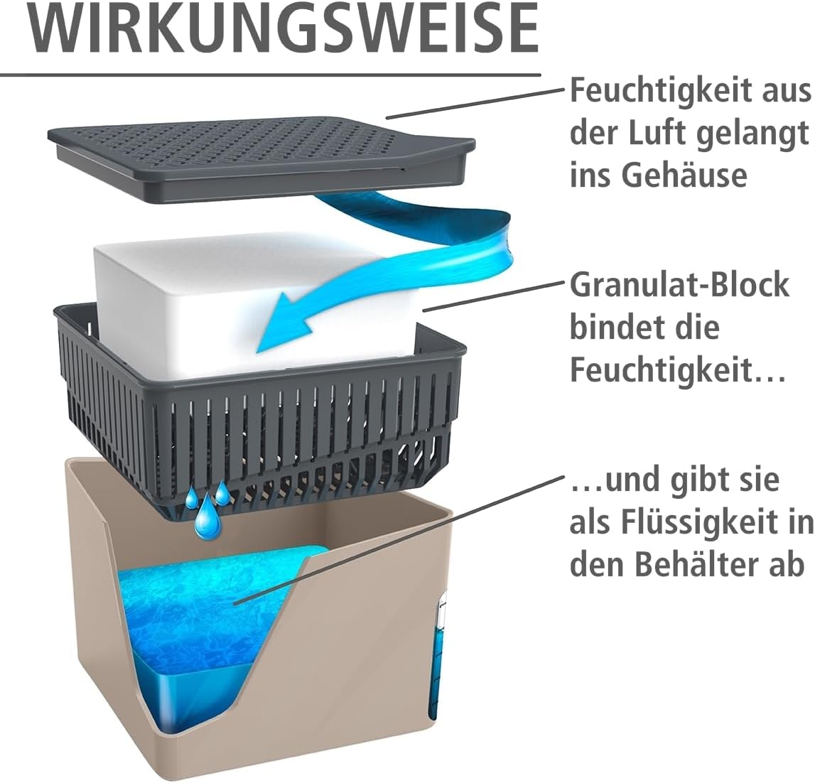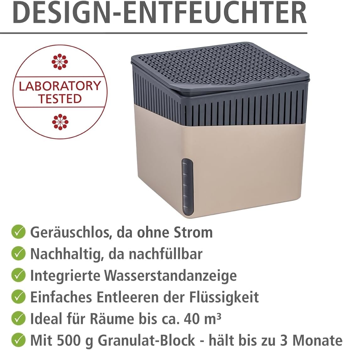 Дизайнерският куб за обезвлажнител от Wenko осигурява по-малко влага и по-приятен климат. Модерният обезвлажнител се интегрира елегантно във всяка стая и създава визуален акцент с модерна кубична форма.