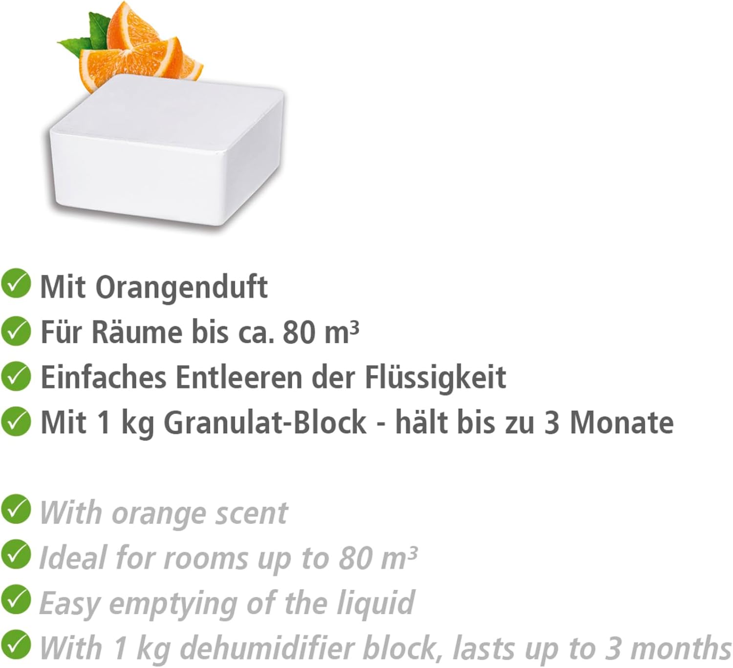 The clever dehumidifier is ideal for rooms of up to 80 m³. The moisture remover contains 1,000 g of calcium chloride for approx. three months. Immediately after setting up, the stone begins to draw moisture from the surroundings.
