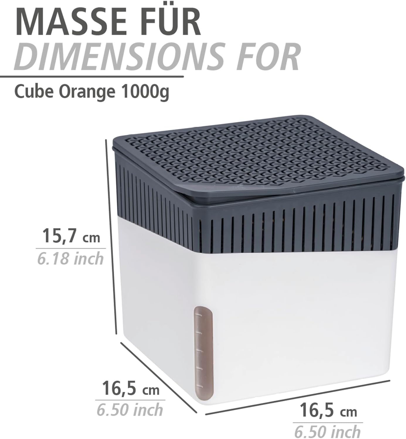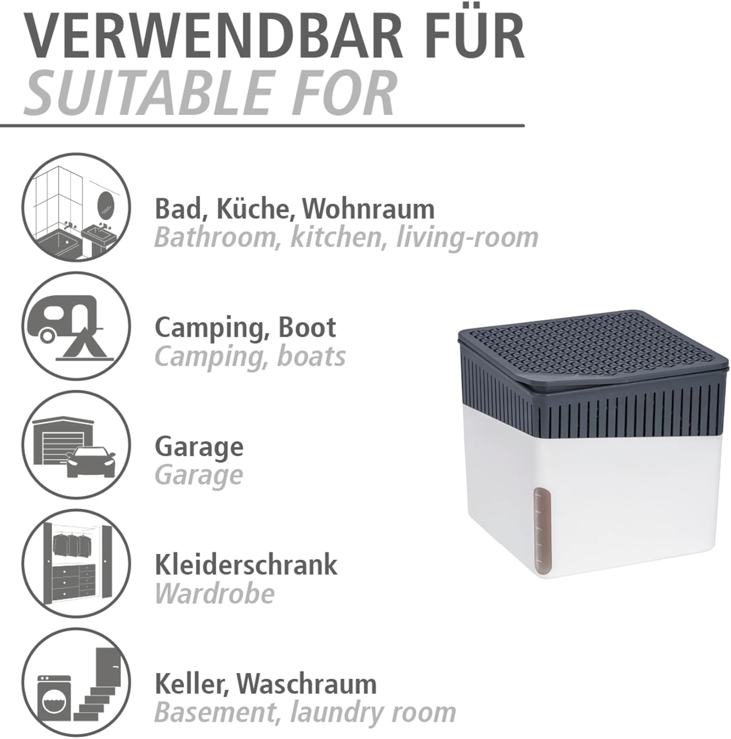 Дизайнерският куб за обезвлажнител от Wenko осигурява по-малко влага и по-приятен климат. Модерният обезвлажнител се интегрира елегантно във всяка стая и създава визуален акцент с модерна кубична форма.