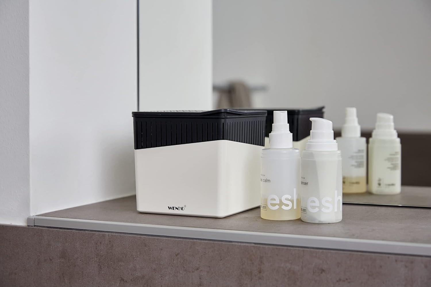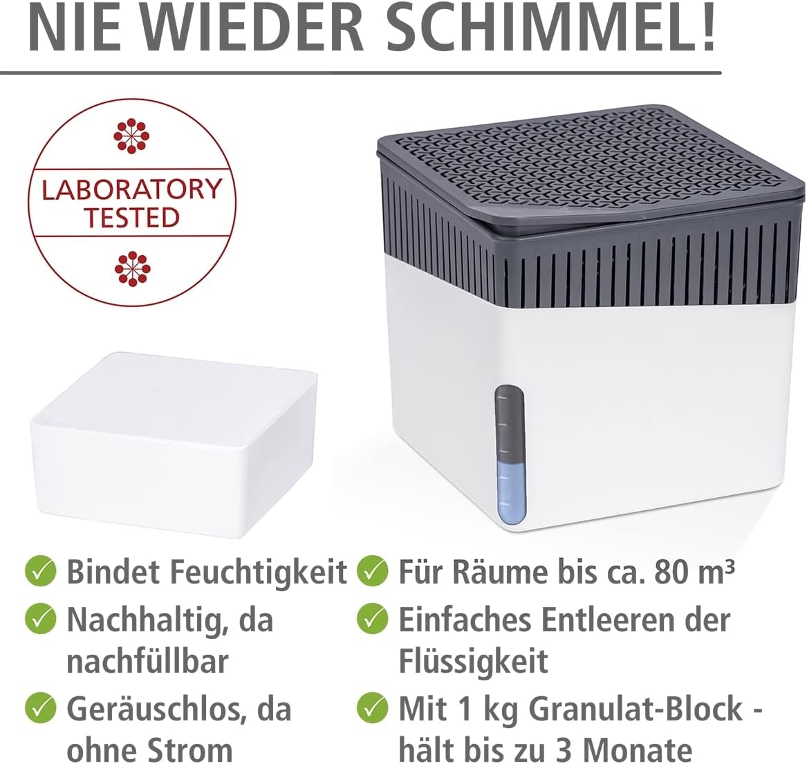 Дизайнерският куб за обезвлажнител от Wenko осигурява по-малко влага и по-приятен климат. Модерният обезвлажнител се интегрира елегантно във всяка стая и създава визуален акцент с модерна кубична форма.