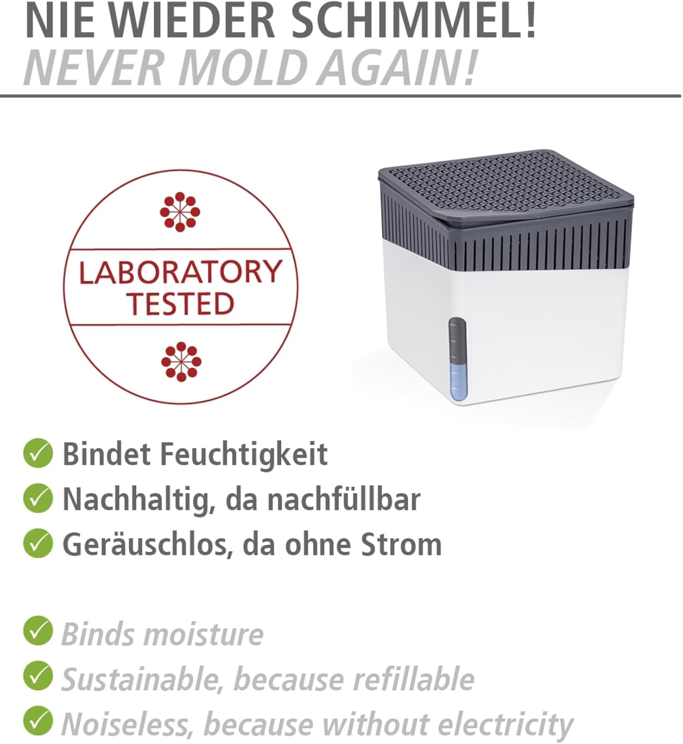 Дизайнерският куб за обезвлажнител от Wenko осигурява по-малко влага и по-приятен климат. Модерният обезвлажнител се интегрира елегантно във всяка стая и създава визуален акцент с модерна кубична форма.