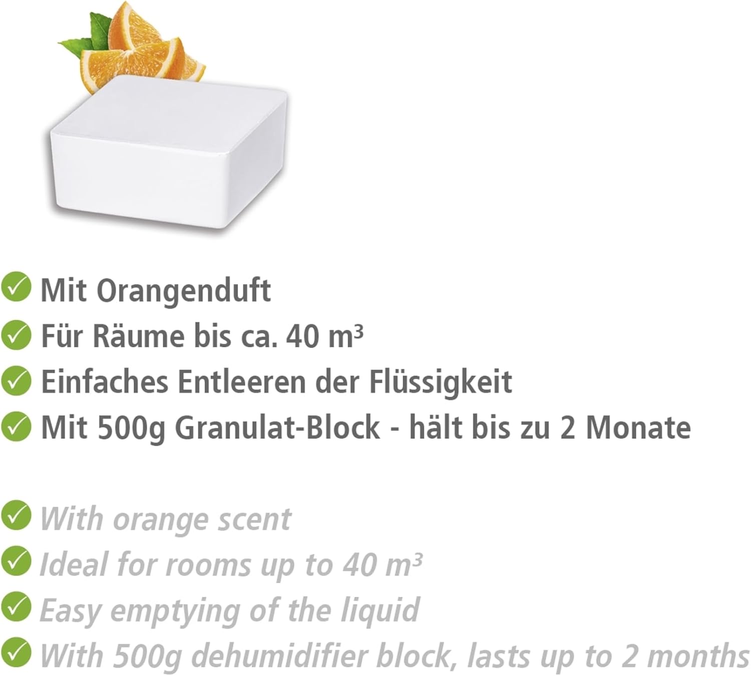 The clever dehumidifier is ideal for rooms of up to 80 m³. The moisture remover contains 1,000 g of calcium chloride for approx. three months. Immediately after setting up, the stone begins to draw moisture from the surroundings.
