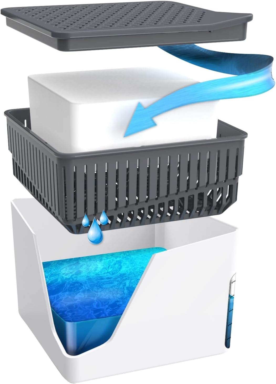 The practical two-piece construction and the raised corner allow easy emptying of the accumulated water from the dehumidifier.