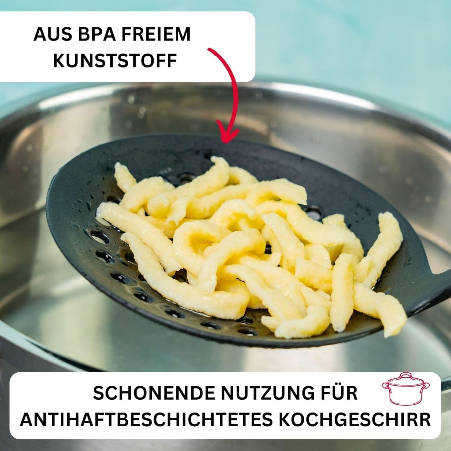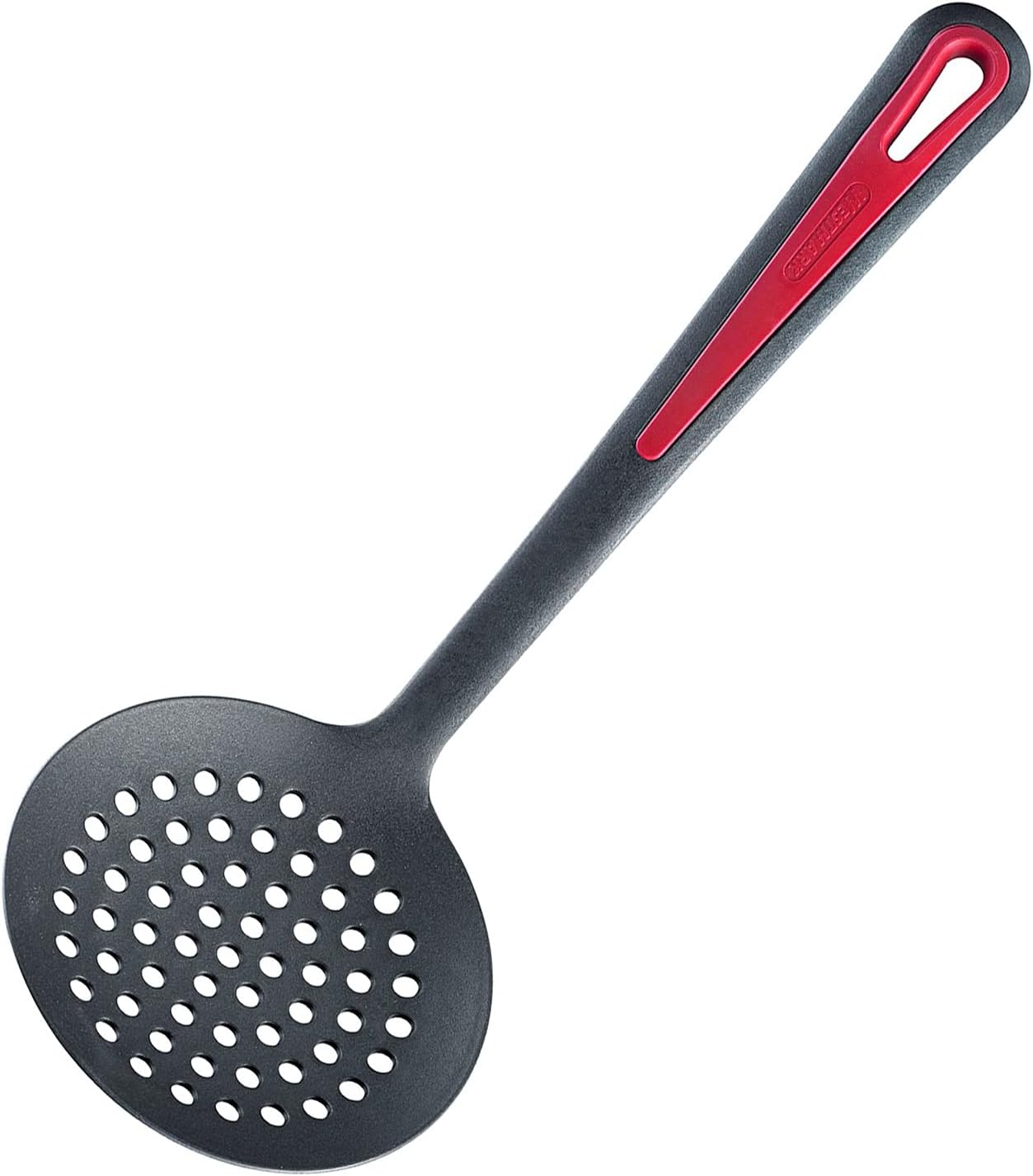 • Лесно загребване, прецеждане и сервиране на паста или зеленчуци благодарение на кръглата, фино нарязана глава; без изгаряне на пръстите благодарение на дългата дръжка; безвкусно и устойчиво на петна.