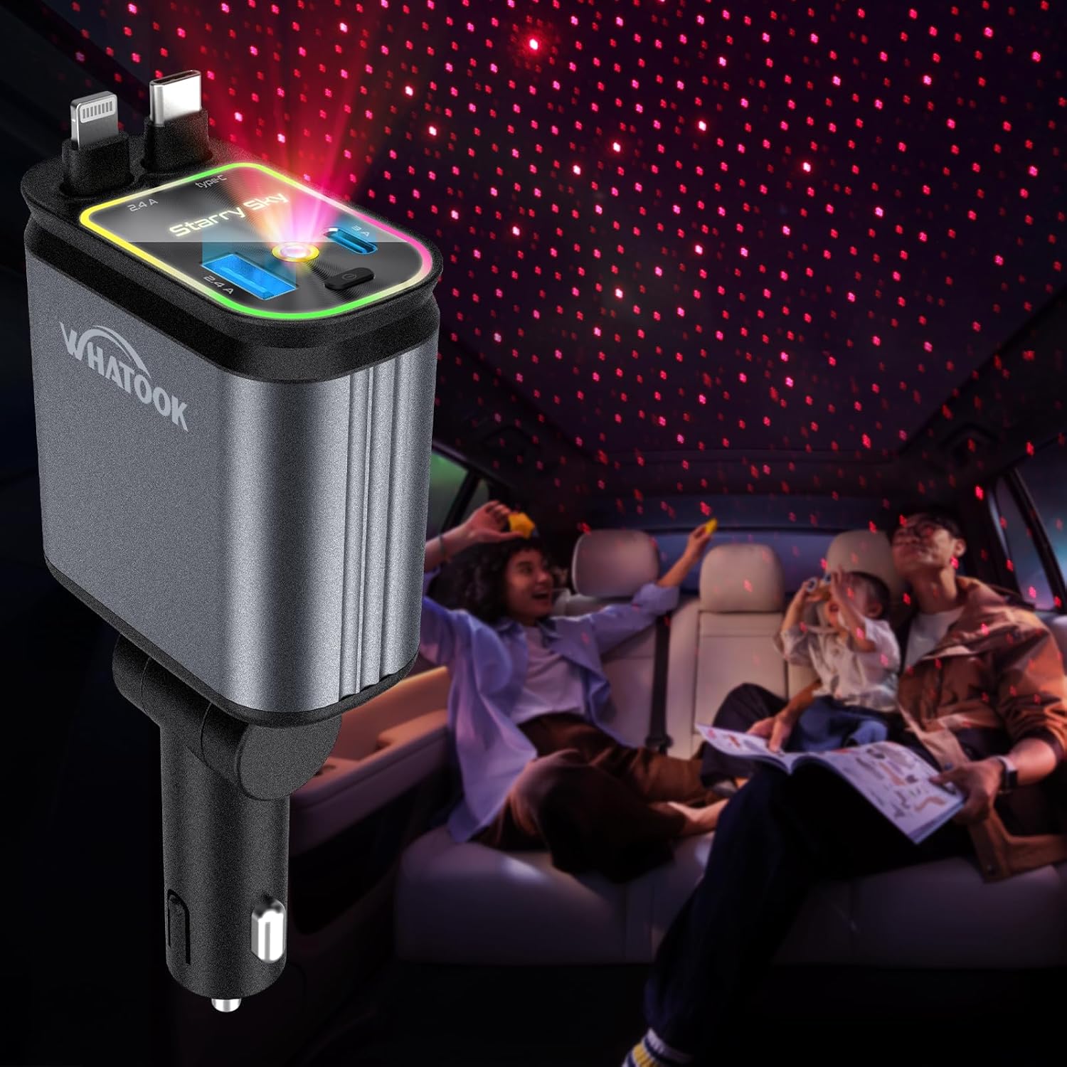 WHATOOK 4-в-1 прибиращо се зарядно за кола със звездно небе LED, 66 W бързо зарядно за мобилен телефон за кола с USB-C/USB-A кабел за запалка, 2 кабела за зареждане за iPhone, Samsung Galaxy, Google Pixel, таблети