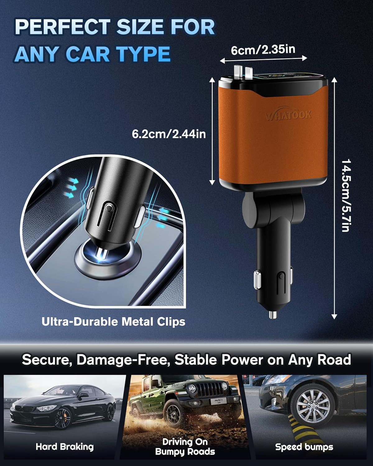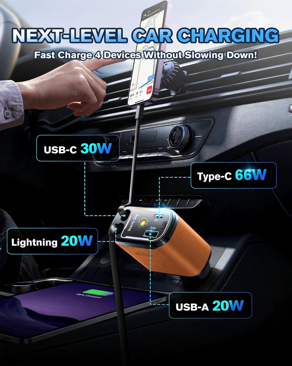 • 4 В 1 ЗАРЯДНО УСТРОЙСТВО С ВГРАДЕНИ КАБЕЛИ: Зареждайте 4 устройства едновременно благодарение на USB-C/USB-A портове + 80 см скрити Lightning и USB-C кабели. Идеално за семейства с iPhone, Samsung Galaxy или таблети и всички USB устройства - идеално за пътувания с кола или бизнес пътувания.