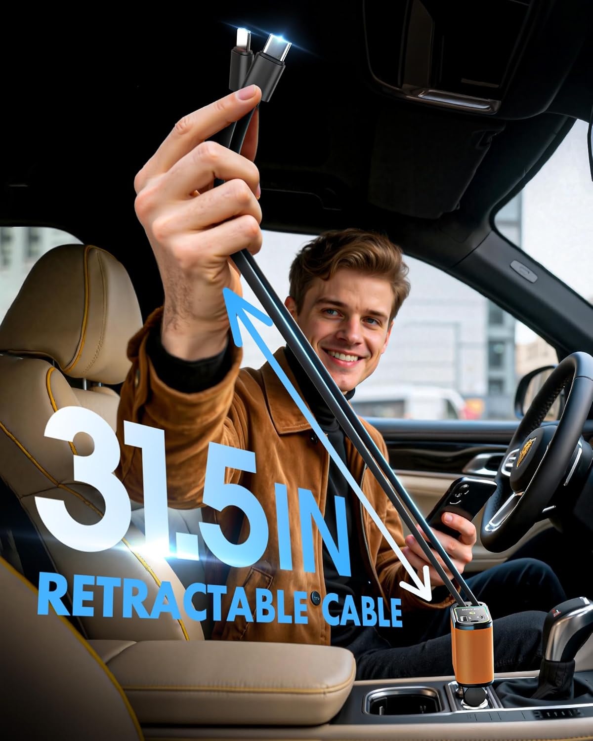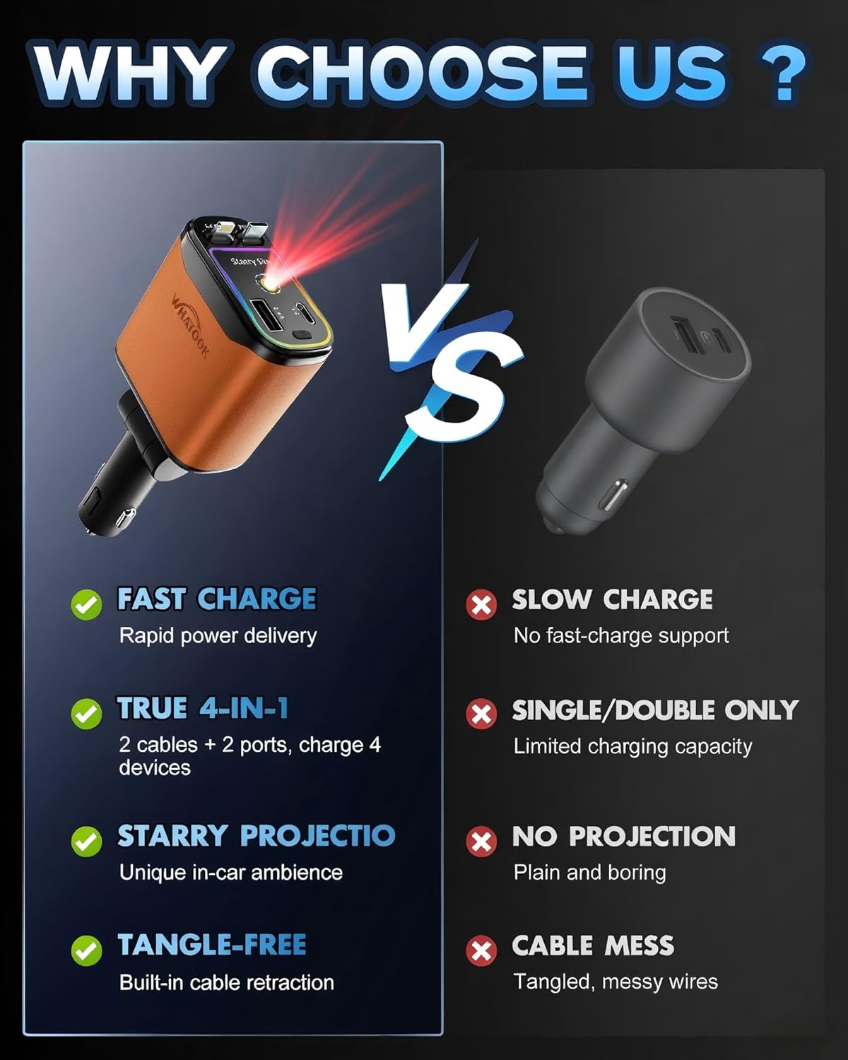 WHATOOK 4-в-1 прибиращо се зарядно за кола със звездно небе LED, 66 W бързо зарядно за мобилен телефон за кола с USB-C/USB-A кабел за запалка, 2 кабела за зареждане за Samsung Galaxy, iPhone, Google Pixel, таблети