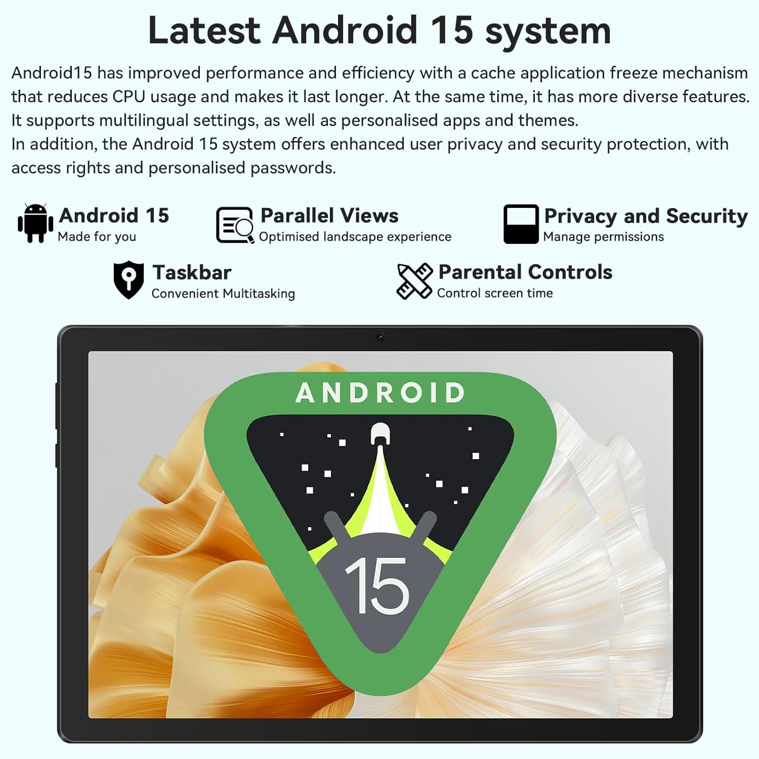 • 【Най-новата версия на Android 15 и осемядрен процесор】Този таблет е оборудван с най-новата система Android 15 и 2.0GHz осемядрен процесор. Той не само генерира малко топлина и консумира малко енергия, но и работи по-плавно и бързо, което значително подобрява ефективността и удобството при използване на таблета. Android 15 подобрява защитата и сигурността на личната поверителност.