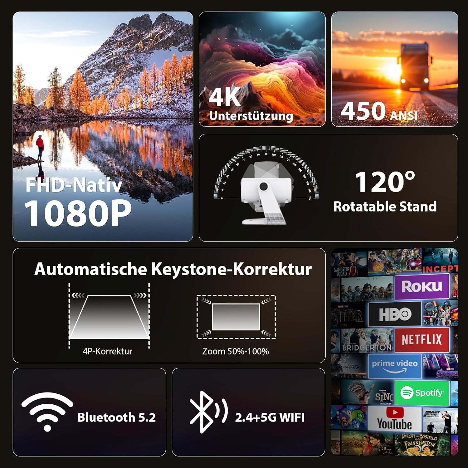 • Нативна поддръжка на 1080p, 4K: Този проектор осигурява ясно 1080p изображение с 4K поддръжка за плавно възпроизвеждане на UHD източници с по-богати цветове и изключителни детайли. С високо контрастно съотношение 2000:1 и кинематографично качество на картината, получавате зашеметяващо визуално изживяване, независимо дали гледате филми, телевизионни предавания или играете игри.