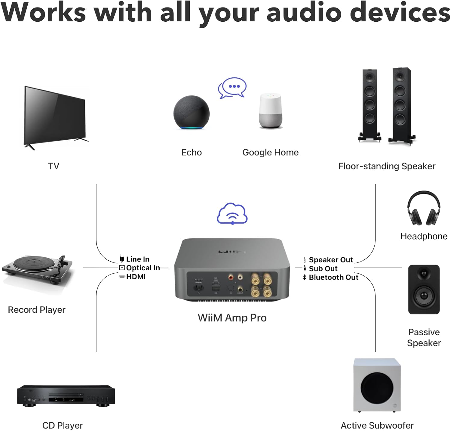 WiiM Amp Pro: Усилвател за стрийминг за множество стаи | Съвместим с Google Cast, Alexa | HDMI, гласово управление | Стрийминг на Spotify, Amazon Music, Tidal и други - тъмносив