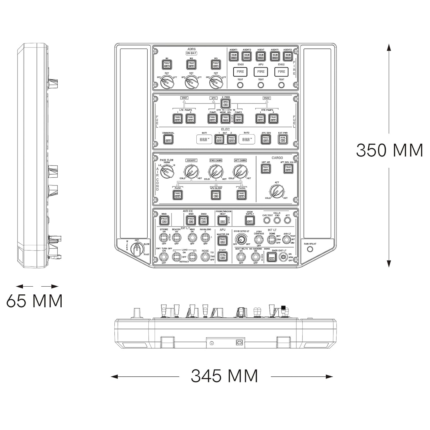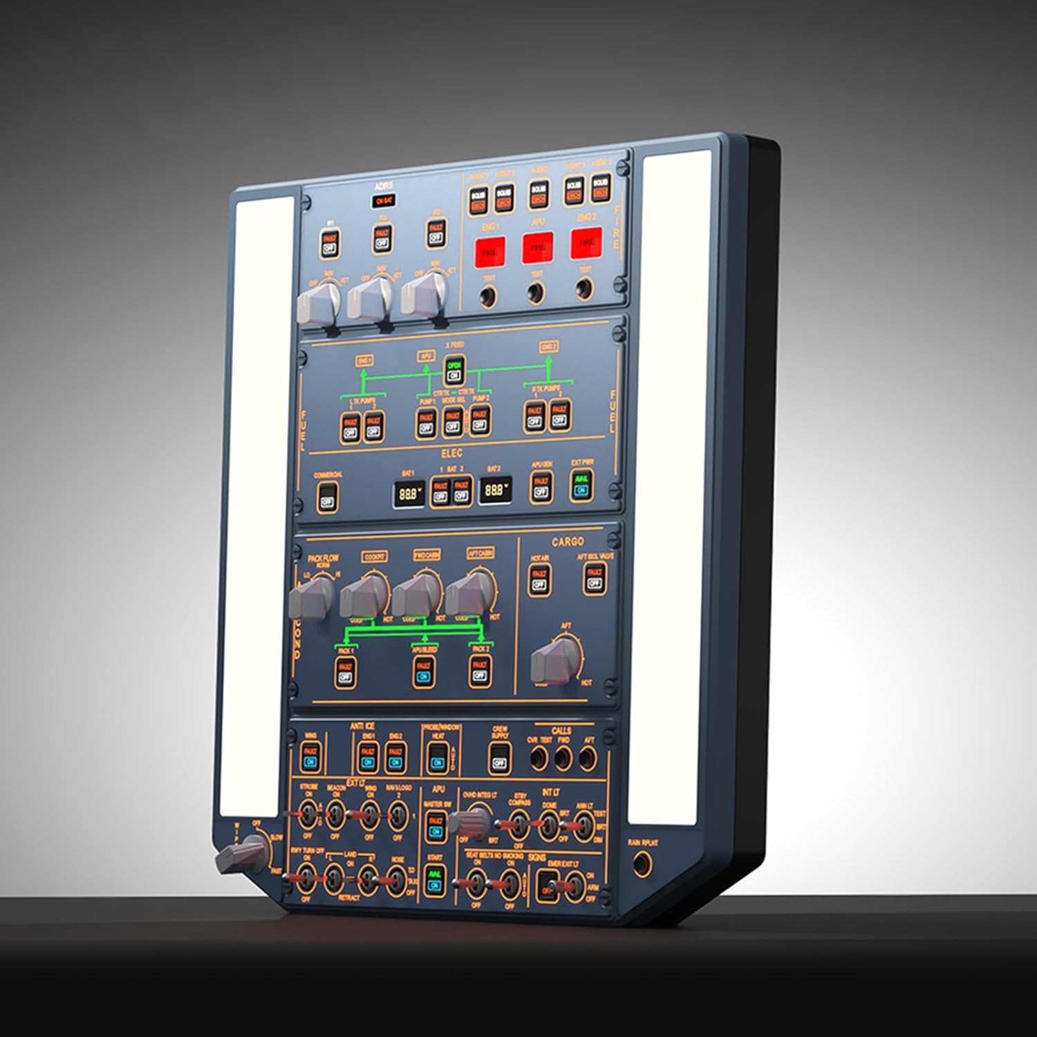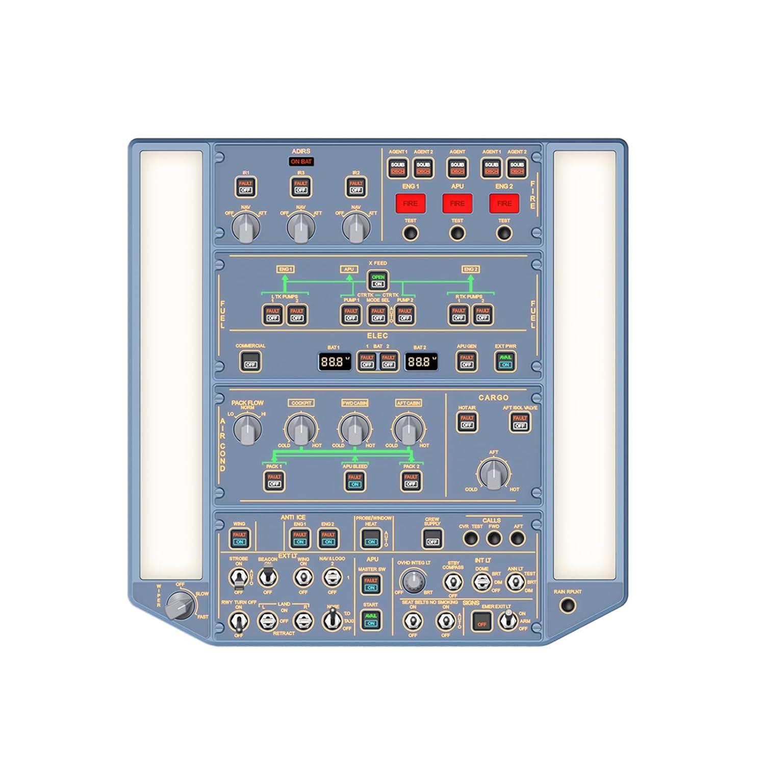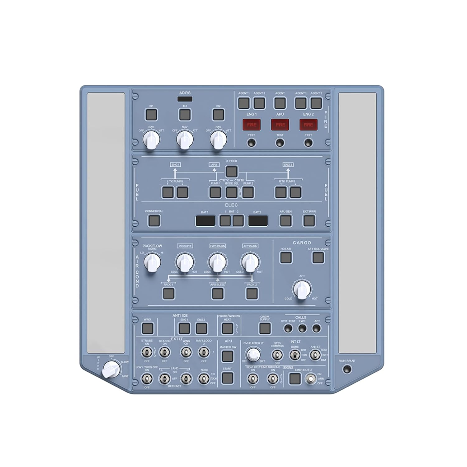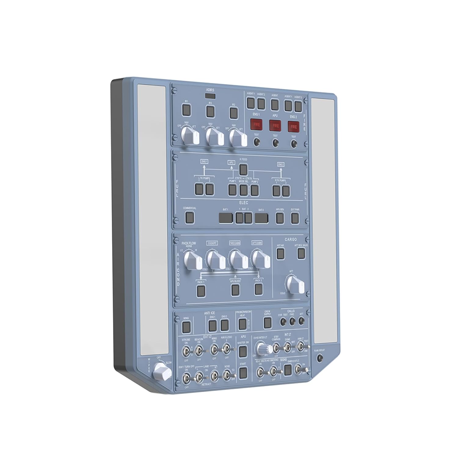• Скрити бутони и двоен режим на работа: Всички бутони работят по реалистична логика. Например, APU MASTER се самозаключва, докато APU START се самонулира. Етикетите са отпечатани невидимо и остават скрити, докато панелът не бъде включен.