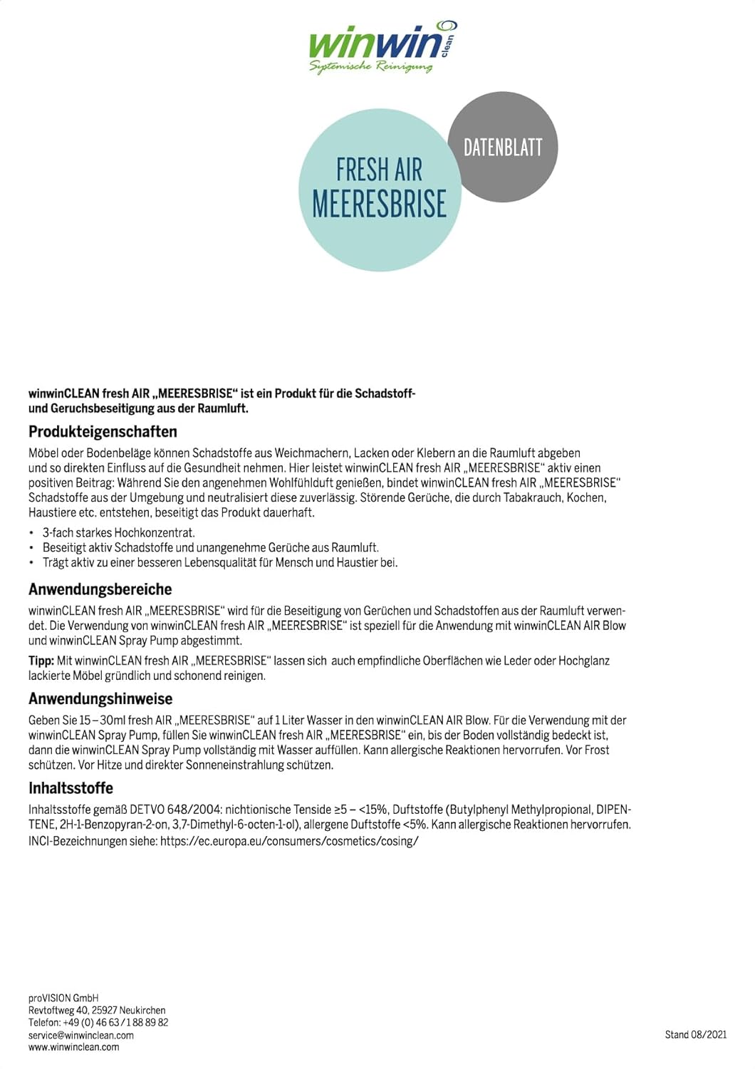 Can I use WinwinCLEAN Fresh Air in diffusers or oil burners? Yes, works best!Can I use winwinCLEAN Fresh Air in water vacuums? Yes, take 15-30 ml Fresh Air on 1.5 litres of water. Can winwinCLEAN Fresh Air also be used for cleaning? Yes, perfect! Especially for cleaning sensitive surfaces, high-gloss painted surfaces, leather etc. Can WinwinClean Fresh Air help allergy sufferers? Yes, in conjunction with the winwinCLEAN Air Blow, dust and suspended particles are significantly reduced. We recommend the neutral version Fresh Air Zero for allergy sufferers.