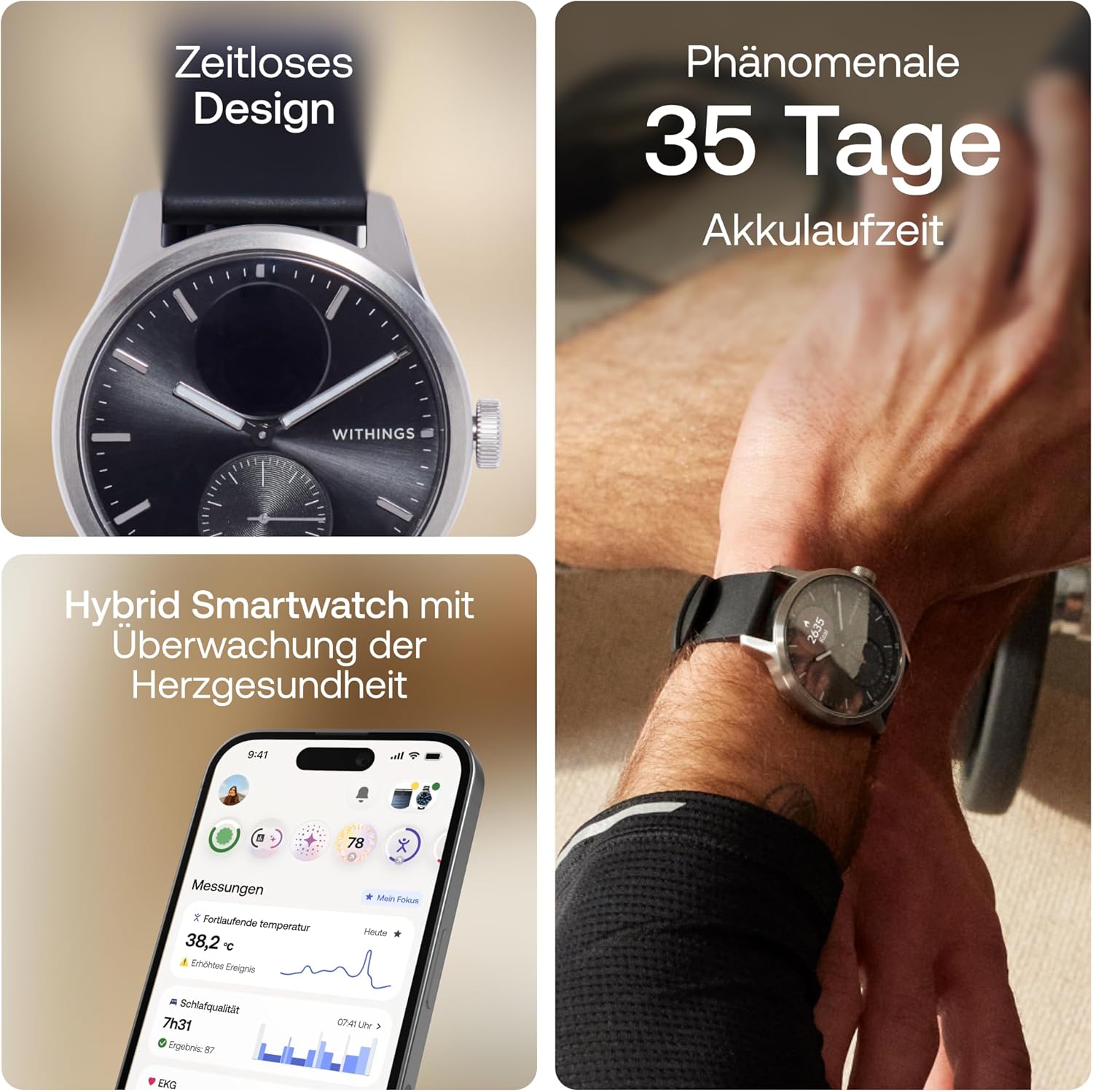 Withings ScanWatch 2 Health - смарт часовник за мъже и жени, ЕКГ, SpO2, температура, проследяване на съня, дишане, водоустойчив, батерия 35 дни, Android и iOS, 42 мм, черен