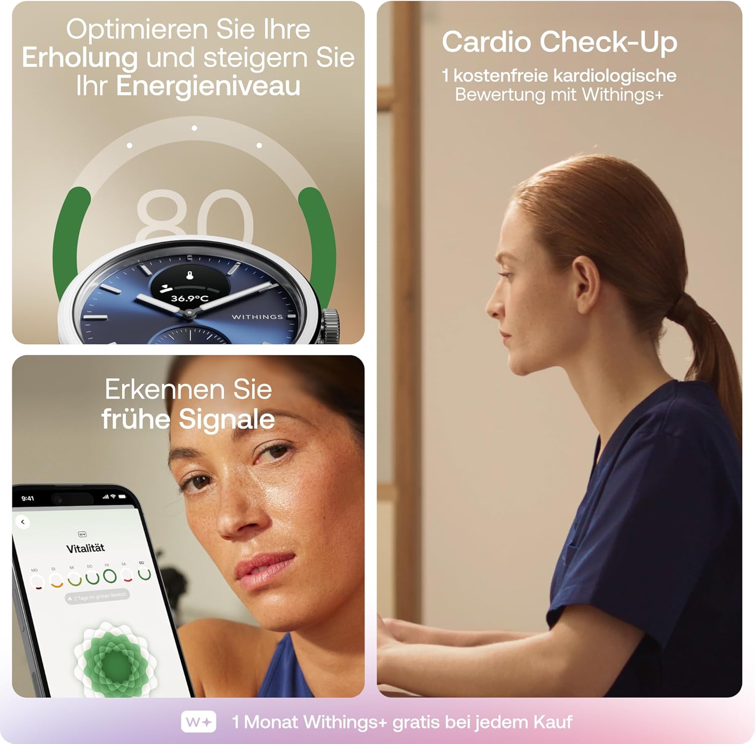 • Проследяване на здравето - Медицинска 30-секундна ЕКГ и непрекъснато наблюдение на сърдечната честота с откриване на предсърдно мъждене чрез приложението Withings. Включва известия за висока или ниска сърдечна честота.