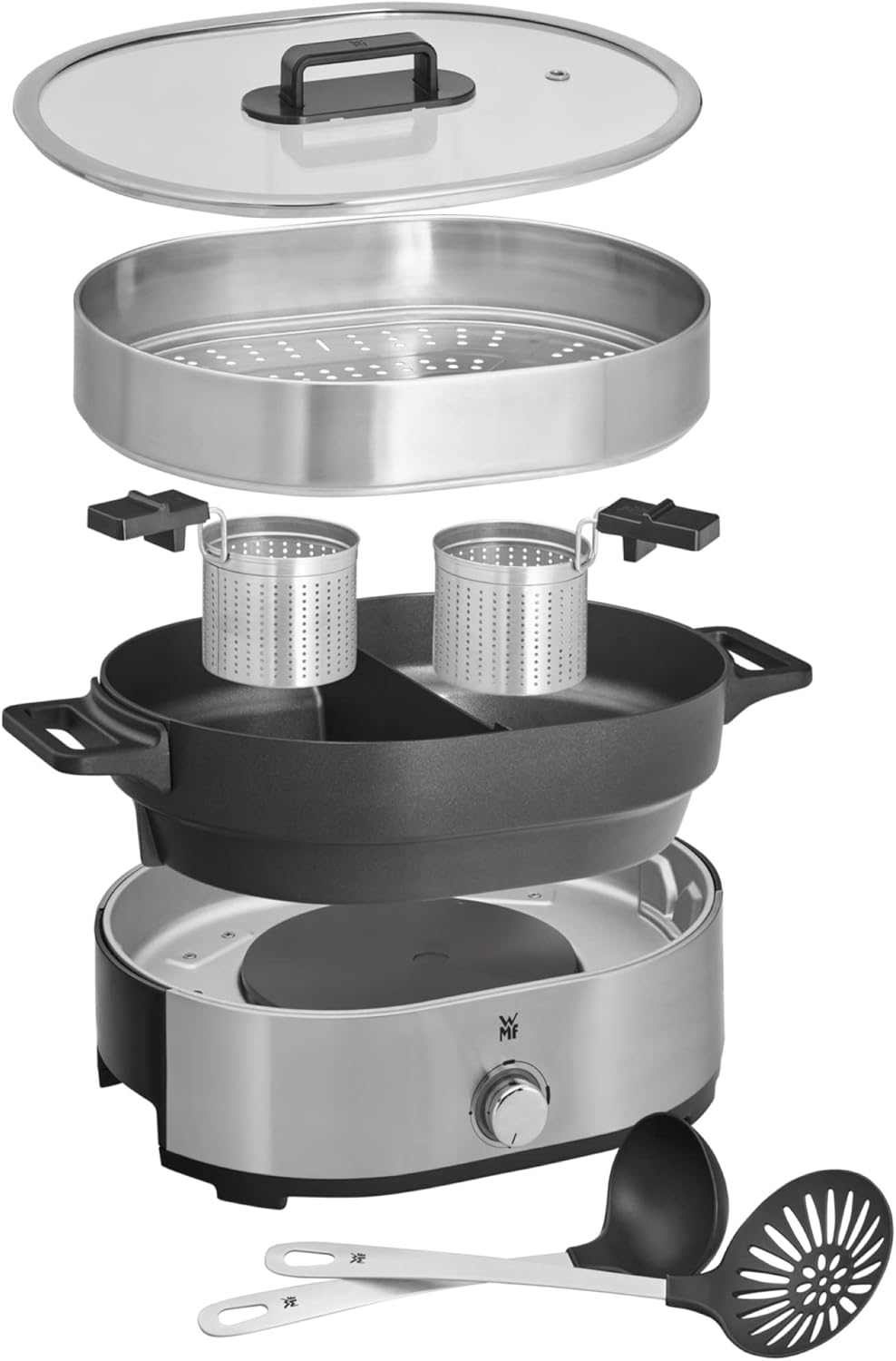 WMF Lono Hot Pot & Steamer Electric 3.6 L, Китайско фондю за 6 души, Електрическа тенджера за готвене на пара, Приставка за пара за Дим Сум, Бао, Кошница за готвене, 1700 W, Матирана неръждаема стомана