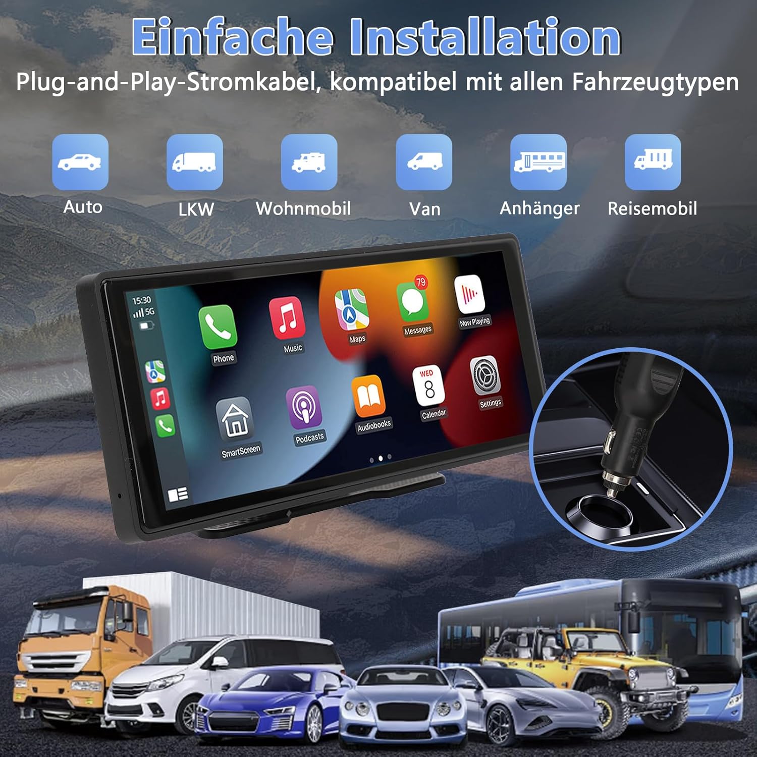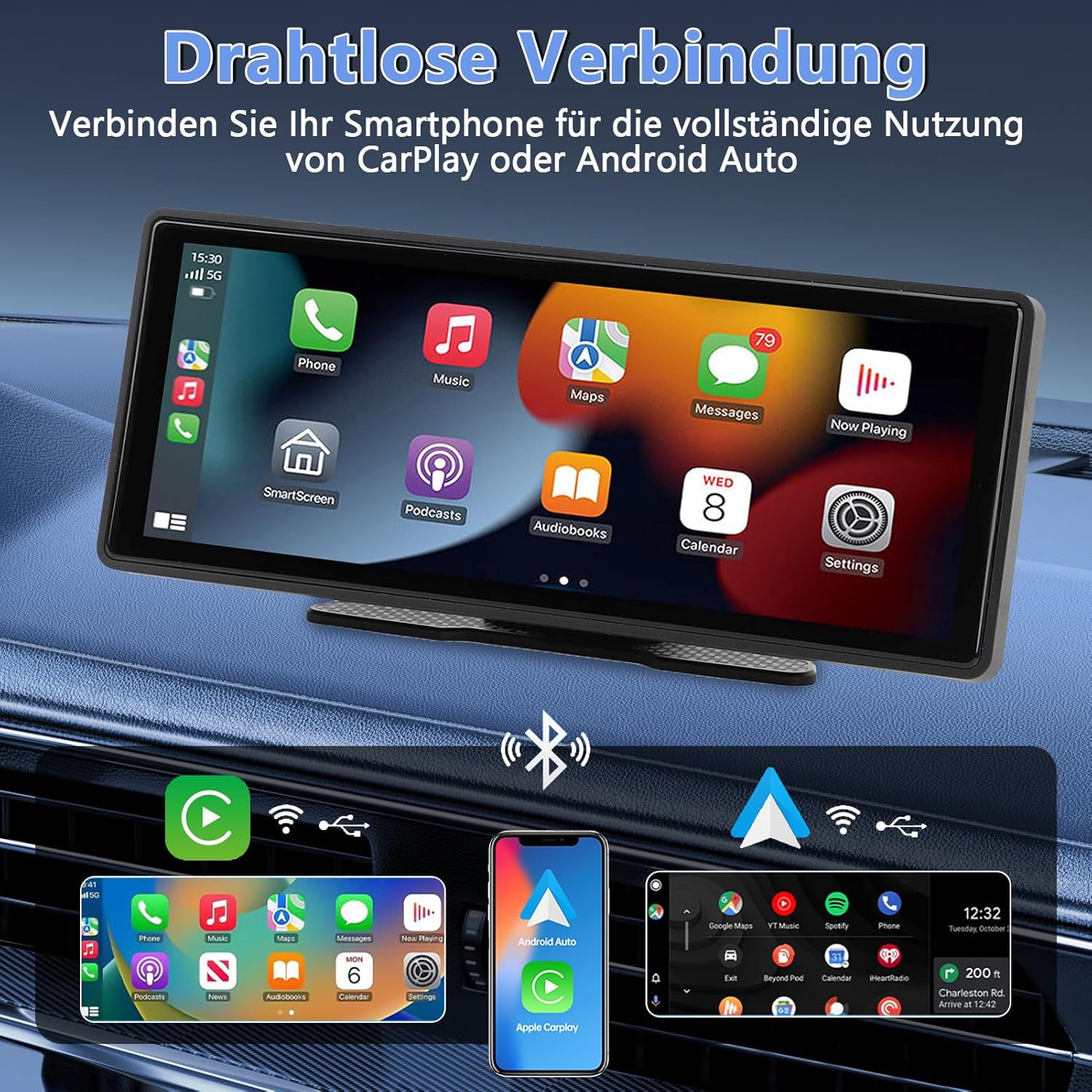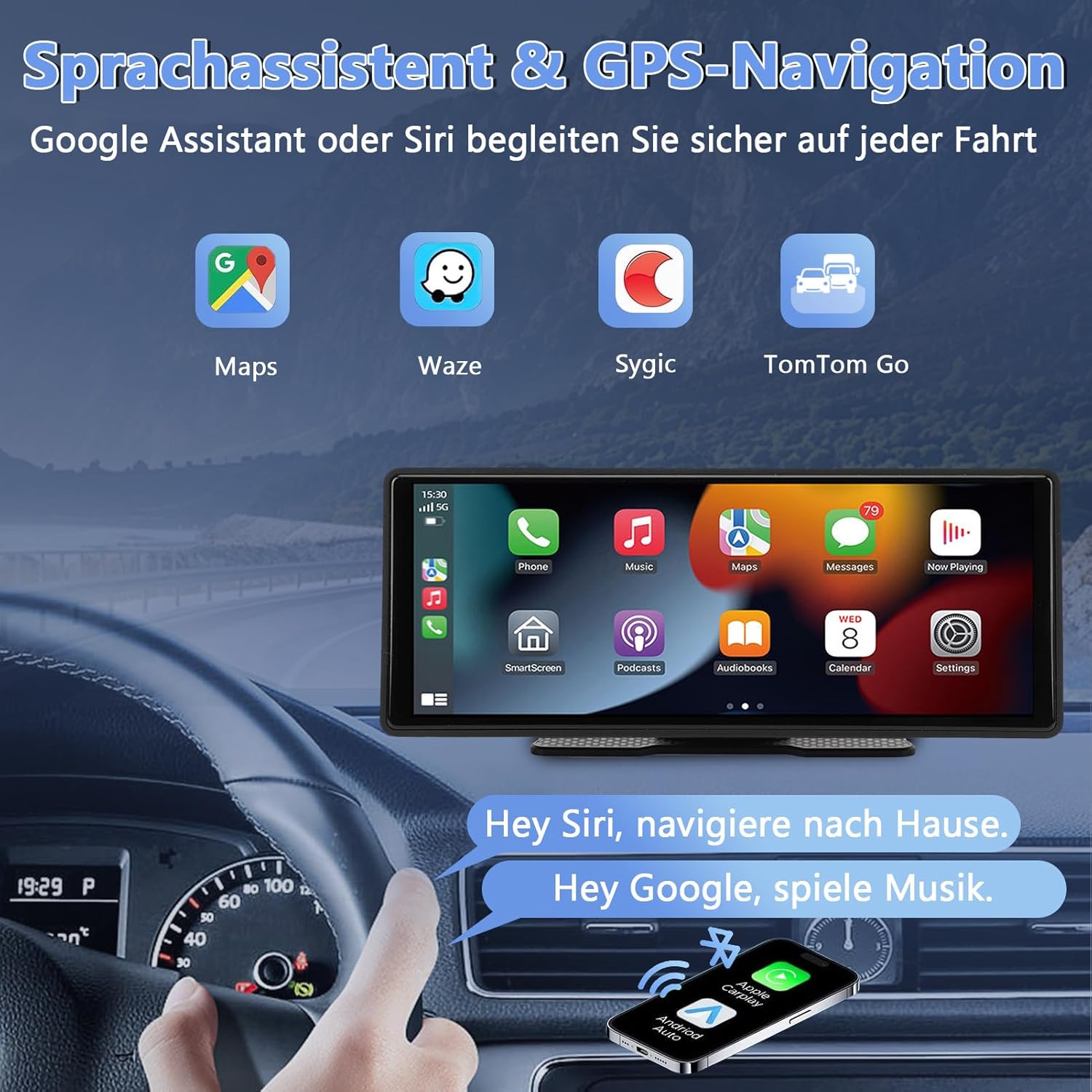 WODHMIEY 10.26-инчов IPS сензорен екран безжично CarPlay и Android автомобил, 1080P HD преносимо автомобилно радио с WiFi, Bluetooth, гласово управление, AUX/FM предаване, навигационна система за кола, камион, кемпер