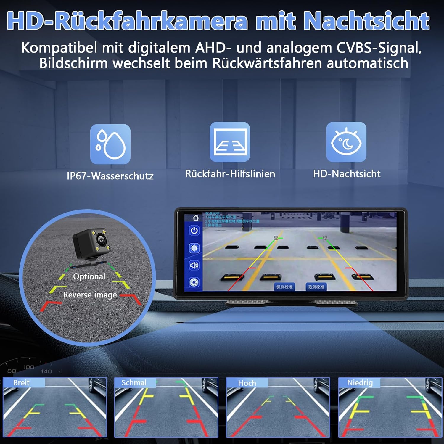 • [1080P камера за задно виждане]: Оборудвано с 1080P камера за задно виждане с висока резолюция, това устройство подобрява видимостта назад и улеснява паркирането. Когато е включена задна предавка, дисплеят автоматично превключва на изображение от движение на заден ход с видими водачи.