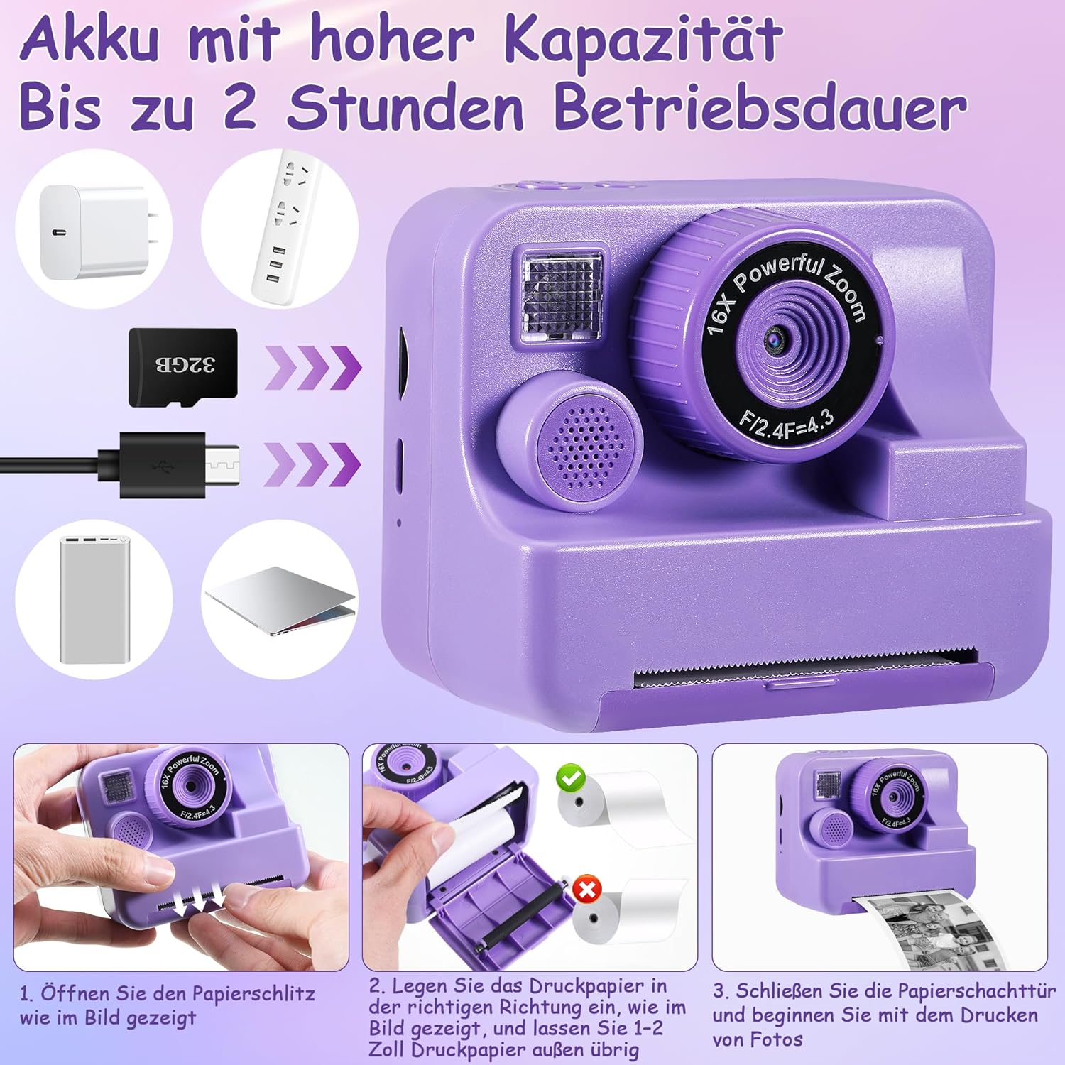 With the worahroe camera, you will receive not only the camera itself, but also a 32GB memory card, 3 rolls of thermal paper, a USB charging cable and much more. The included colour markers offer children even more possibilities for creative design of their photos. It's the perfect set to get started right away and take those first photos - no additional purchase of accessories required.