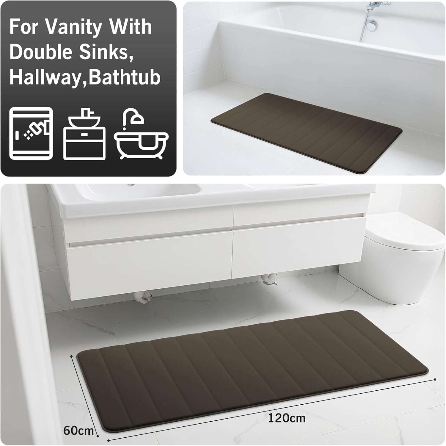 wyewye Килим за баня от мемори пяна 60x120 см, кафяв, ултра мек, неплъзгащ се, с технология за бързо съхнене