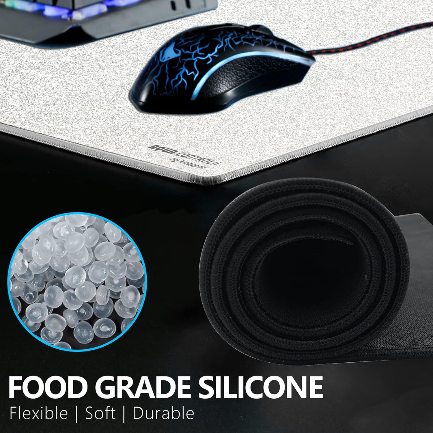 • Текстура на повърхността: посоката на плетене на тъканата текстура на предната част на гумения материал е неравномерна и управлението на мишката по оста X/Y не се влияе по време на игра, което намалява усещането за ограничено плъзгане по повърхността. Подложката е с дизайн, устойчив на пот, а повърхността на мишката не влияе на плъзгането на мишката по време на игра, когато е мокра или изпотена, което е подходящо за играчи с потни ръце.