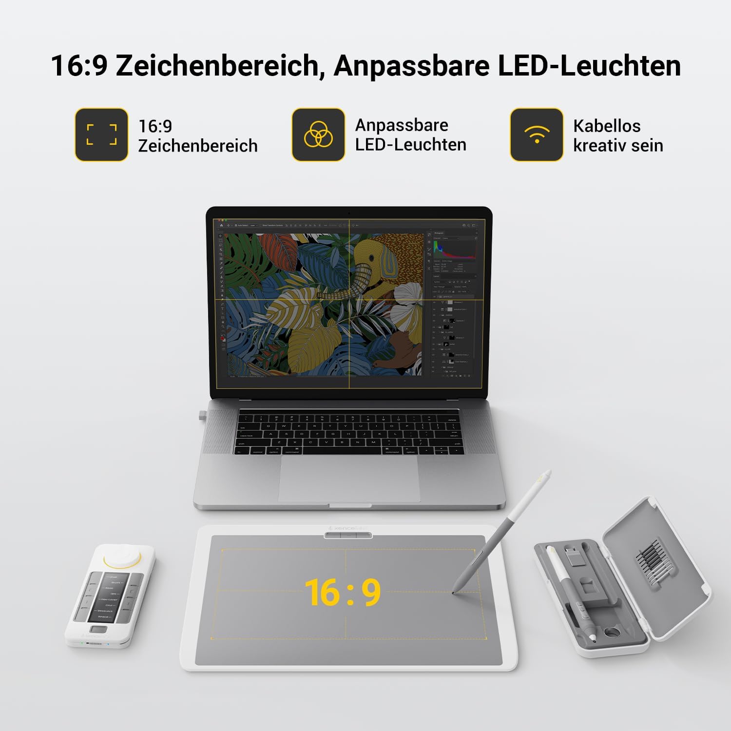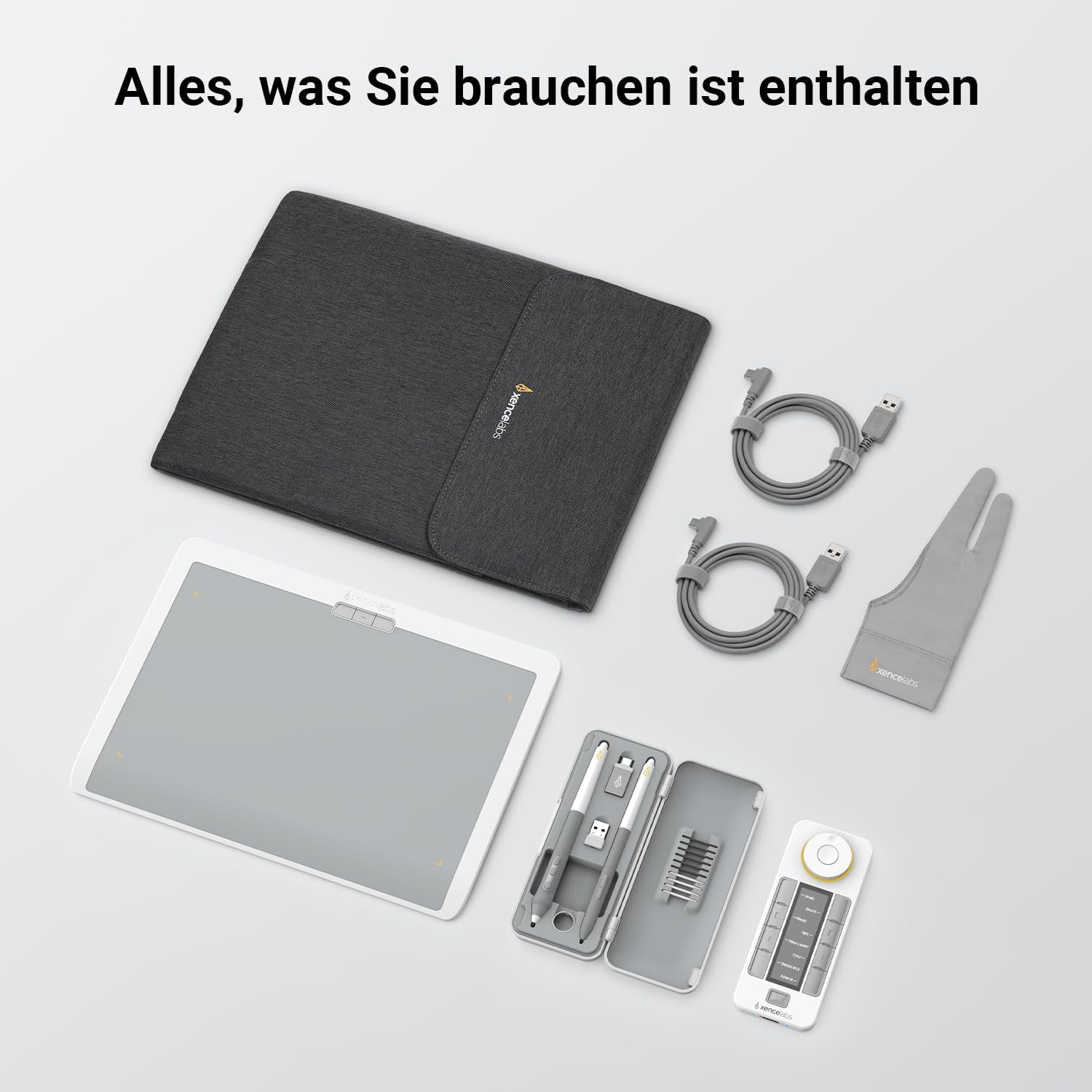 • Комплект аксесоари „всичко в едно“: Всичко освен идеите: Разопаковайте и започнете да творите! Комплектът включва две писалки, 10 пера (6 стандартни, 4 филцови), ръкавица, калъф, Bluetooth адаптер – дори слот за заключване Kensington за студиа. Не са необходими допълнителни покупки: Оборудвали сме го с професионални инструменти.