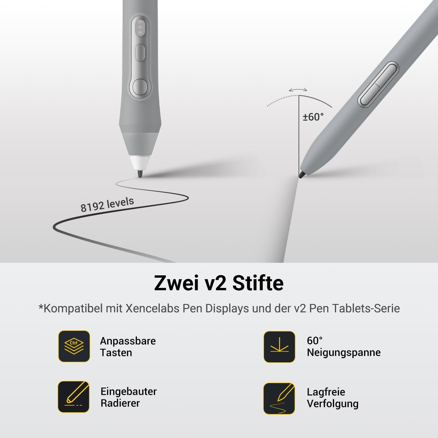 • Две v2 писалки: Персонализиран захват за всеки творчески стил: Край на универсалните писалки! Използвайте две v2 писалки – едната с три бутона и едната тънка – всяка с различни повърхности за захващане, оптимизирани както за десничари, така и за левичари. Благодарение на 8192 нива на натиск, можете да променяте дебелината на линията, точно както с истинска четка за рисуване. Писалките са съвместими и с дисплеи Xencelabs, така че винаги имате резервна, ако една се изгуби, и работният ви процес не се прекъсва.