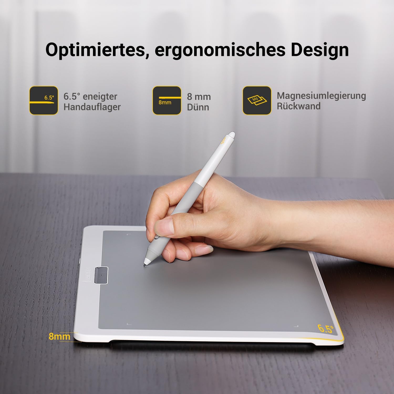 • Ергономичен дизайн: Кажете сбогом на болката в китката: Извитата на 6,5° опора за длани е повече от просто дизайн – тя облекчава дискомфорта по време на дълги сесии на рисуване. С дебелина само 8 мм и метална задна плоча, тя е достатъчно лека, за да се побере в раницата ви, но същевременно достатъчно издръжлива за ежедневна употреба. Левичари или десничари? Горните бутони са лесно достъпни за всички.