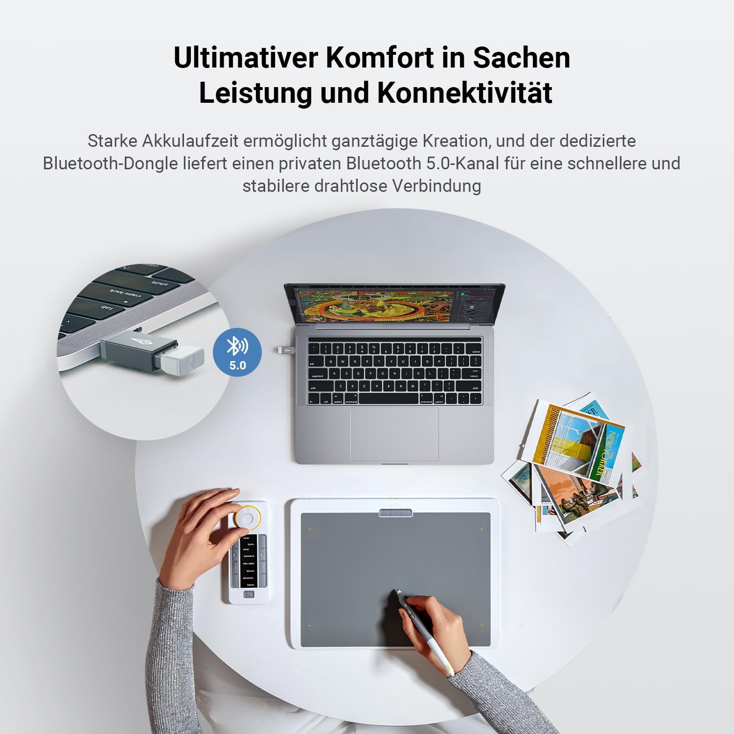 • Безжична свобода с надеждна свързаност: Край на заплетените кабели или прекъснатите връзки! С Bluetooth 5.0 (частен) и специален адаптер, се наслаждавате на изключително стабилна връзка – дори в райони с висока Wi-Fi употреба. Батерията с капацитет 3000 mAh осигурява до 16 часа неограничено време за рисуване с едно зареждане. Така че можете да творите от сутрин до вечер, без постоянно да презареждате.