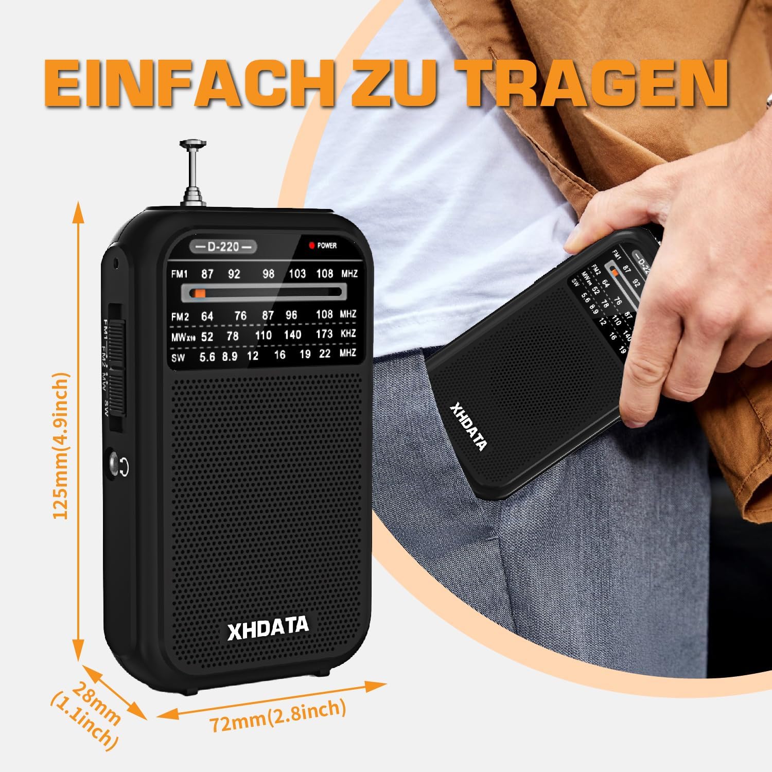 XHDATA D220 Радио малко, FM AM FM радио, радио с батерии, радио с приемник от цял ​​свят, джобно радио с отлично качество на приемане, за семейството и възрастните хора (черно)