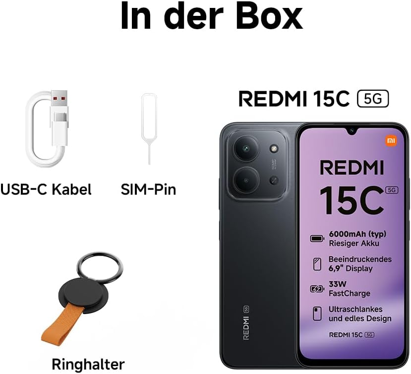 • Солидна батерия от 6000 mAh (тип) - Повече мощност, но тънък корпус: Redmi 15C има масивна батерия от 6000 mAh в тънък корпус. Насладете се на изключително дълъг живот на батерията, без да жертвате стил или комфорт - проектиран да захранва вашия ден и още много други неща.