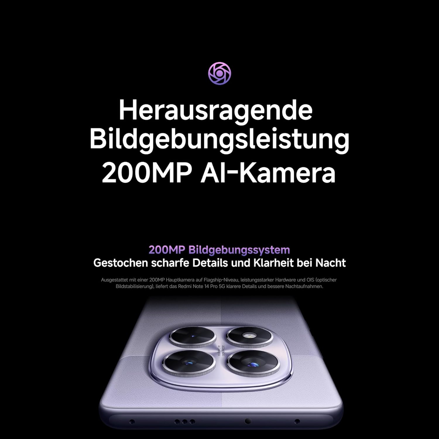 Xiaomi Redmi Note 14 Pro, 5G смартфон, 8 + 256 GB, лилав, 200 MP професионална AI камера, IP68, 45 W TurboCharge с батерия 5110 mAh, AI функции (зарядното не е включено)
