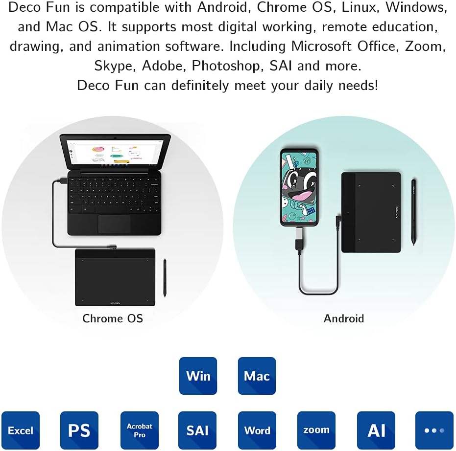 • Съвместим с Windows и Mac OS. Поддържа повечето софтуерни продукти, използвани за работа от разстояние, дистанционно обучение, рисуване и анимация: Microsoft Office, Zoom, Skype, Adobe, Photoshop, UPS и др. Deco Fun се адаптира перфектно към вашите ежедневни нужди.