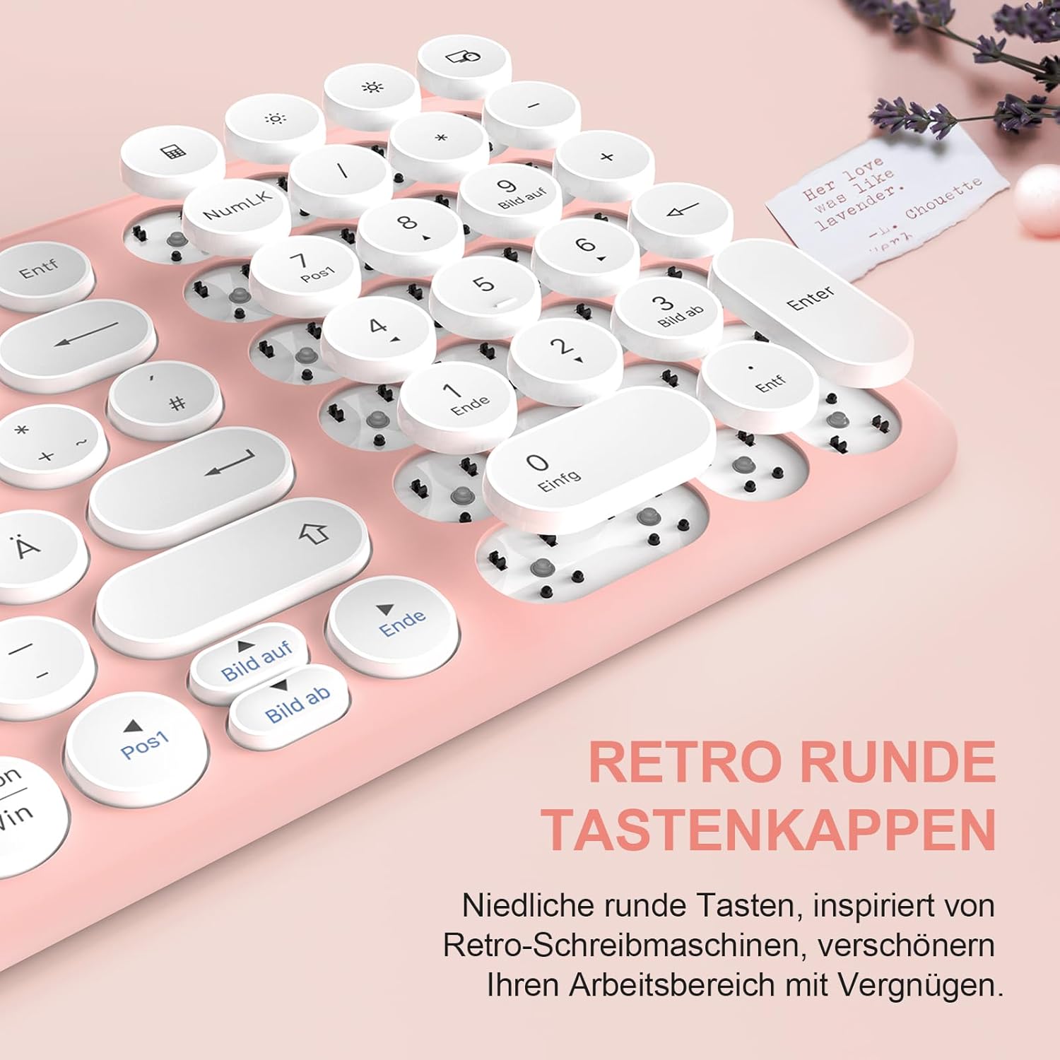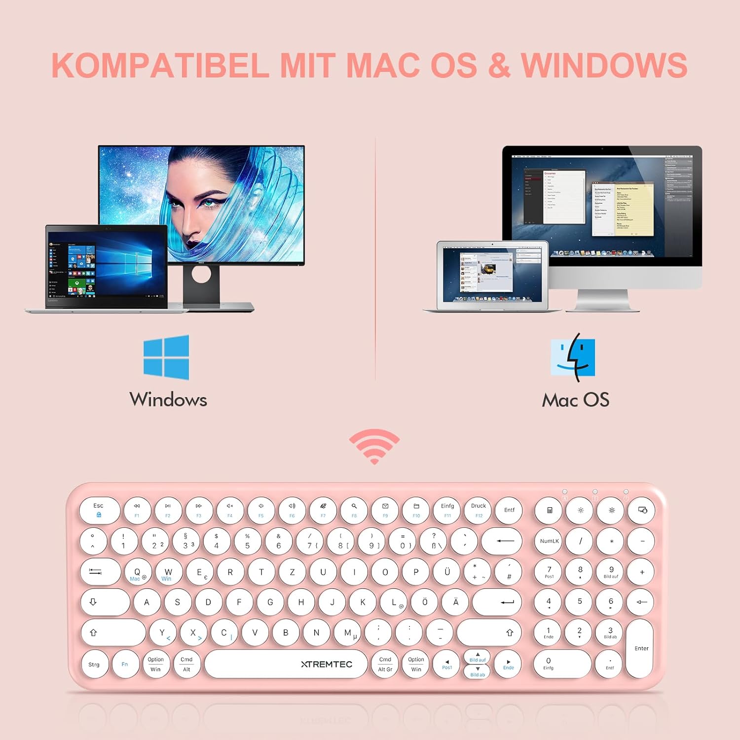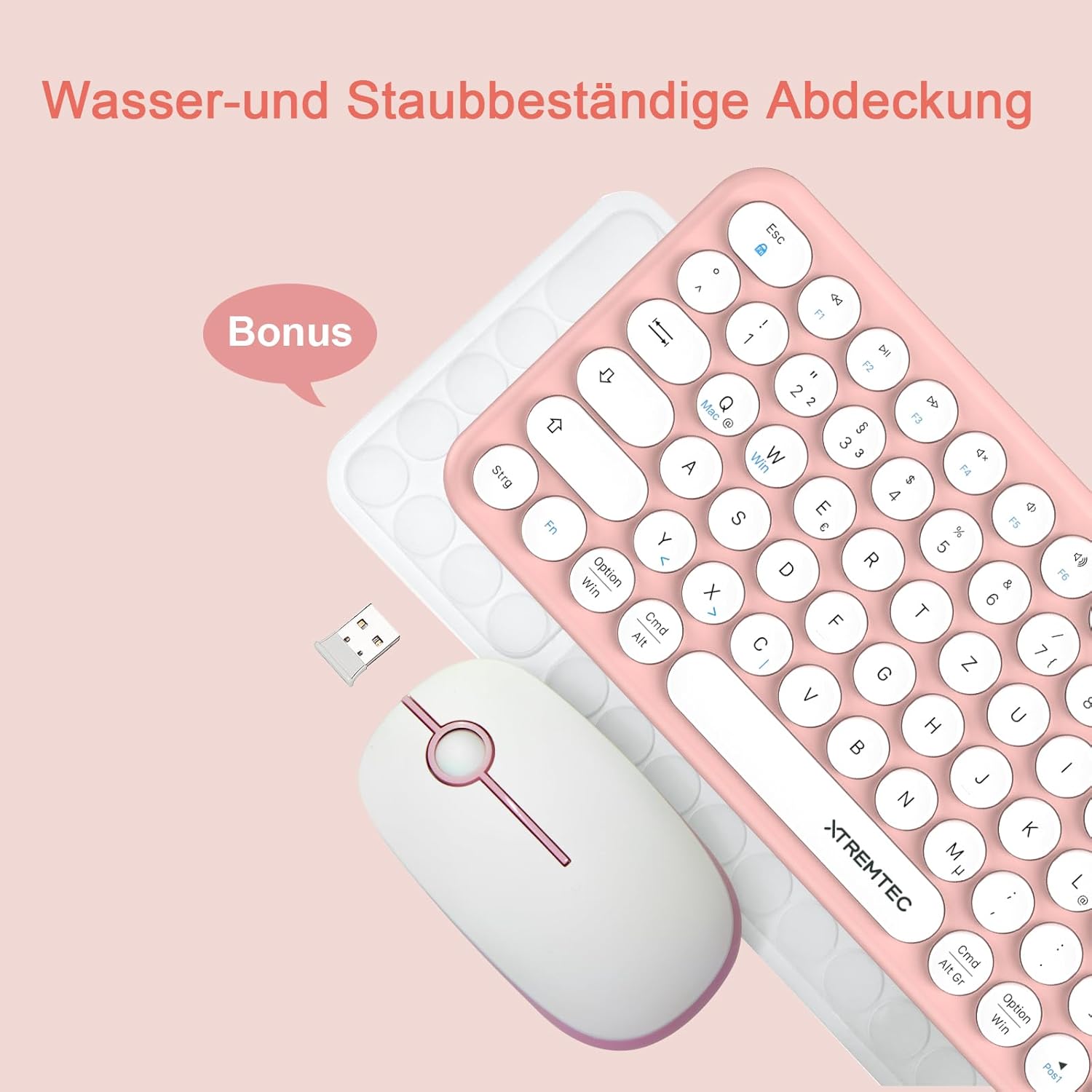 XTREMTEC Безжична клавиатура и мишка, Ретро кръгла клавиатура за пишеща машина, Тънка безжична клавиатура, тих комплект, USB 2.4GHz връзка, Компактна клавиатура за лаптоп, iMac, Windows, PC (Розово-бяла) Немски