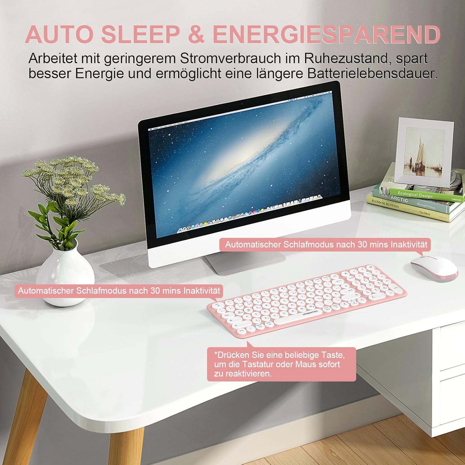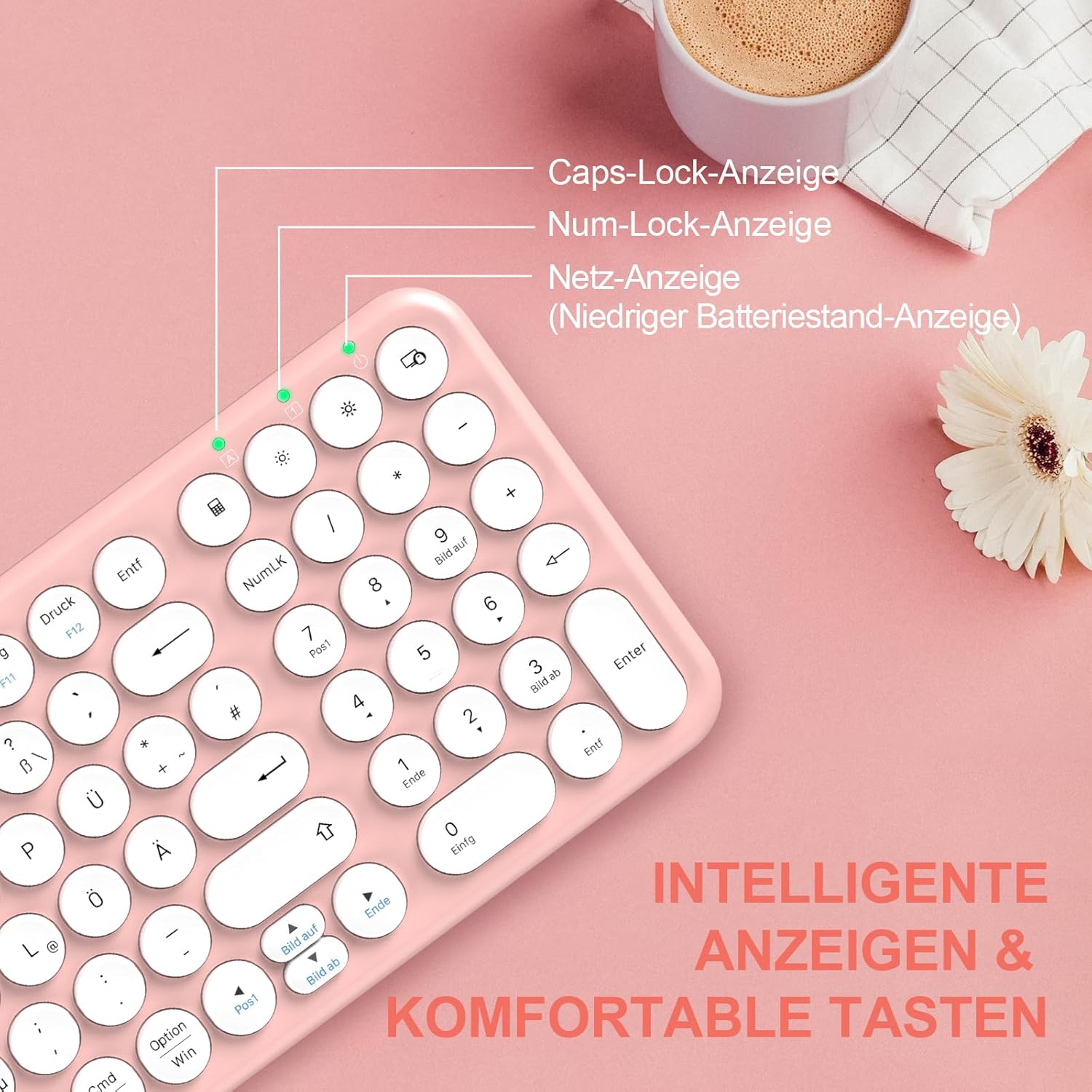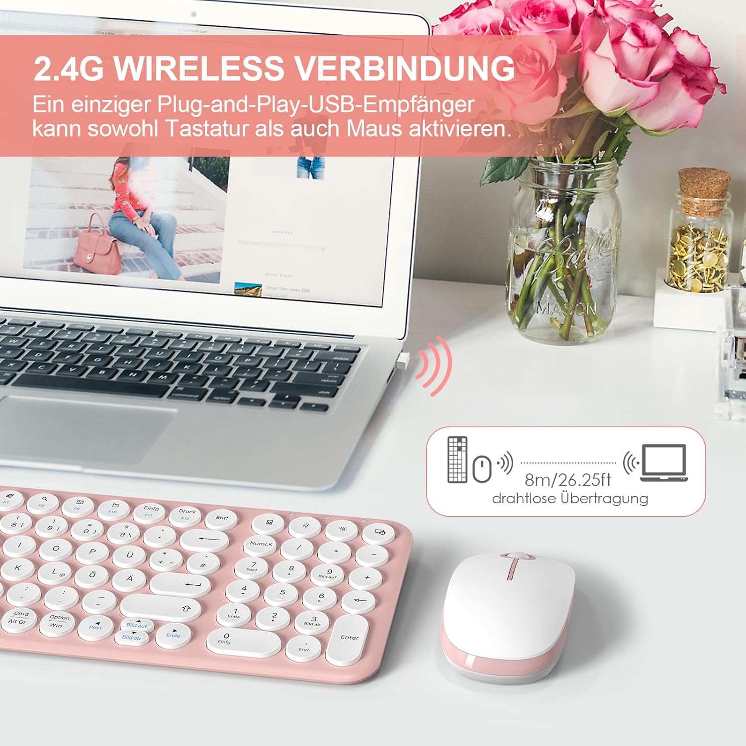 XTREMTEC Безжична клавиатура и мишка, Ретро кръгла клавиатура за пишеща машина, Тънка безжична клавиатура, тих комплект, USB 2.4GHz връзка, Компактна клавиатура за лаптоп, iMac, Windows, PC (Розово-бяла) Немски