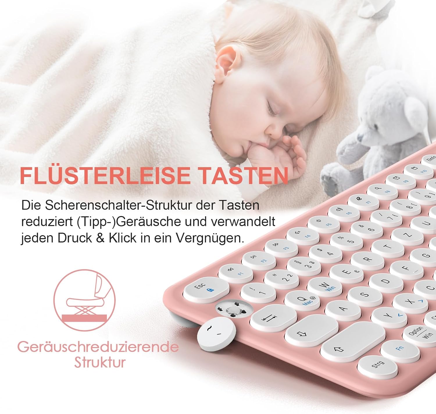 • ТИХ КОМПЛЕКТ КЛАВИАТУРА И МИШКА: Шумопотискащият дизайн тип „ножично кръстосано“ на симпатичните кръгли клавиши е най-подходящ за офис работа в тиха среда. Безшумна безжична клавиатура и мишка. Ще се влюбите и в мекото докосване на оптичната мишка и матовото покритие на всеки клавиш.