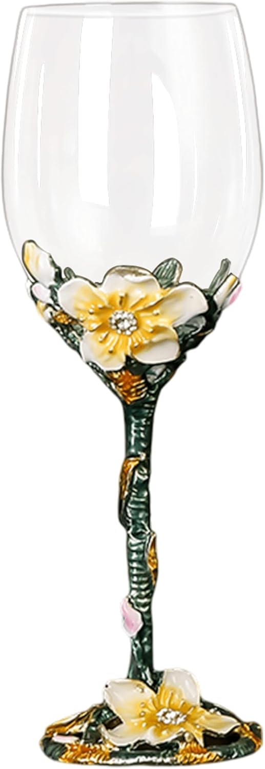 • Тази ръчно изработена емайлирана чаша за вино се отличава с елегантен стил с лилави, розови, жълти и сини 3D цветя. Тя няма да избледнее с времето. Чашата е блестяща и полупрозрачна, класическа, но изискана, а елегантният ѝ, стилен вид е едновременно функционален и декоративен.